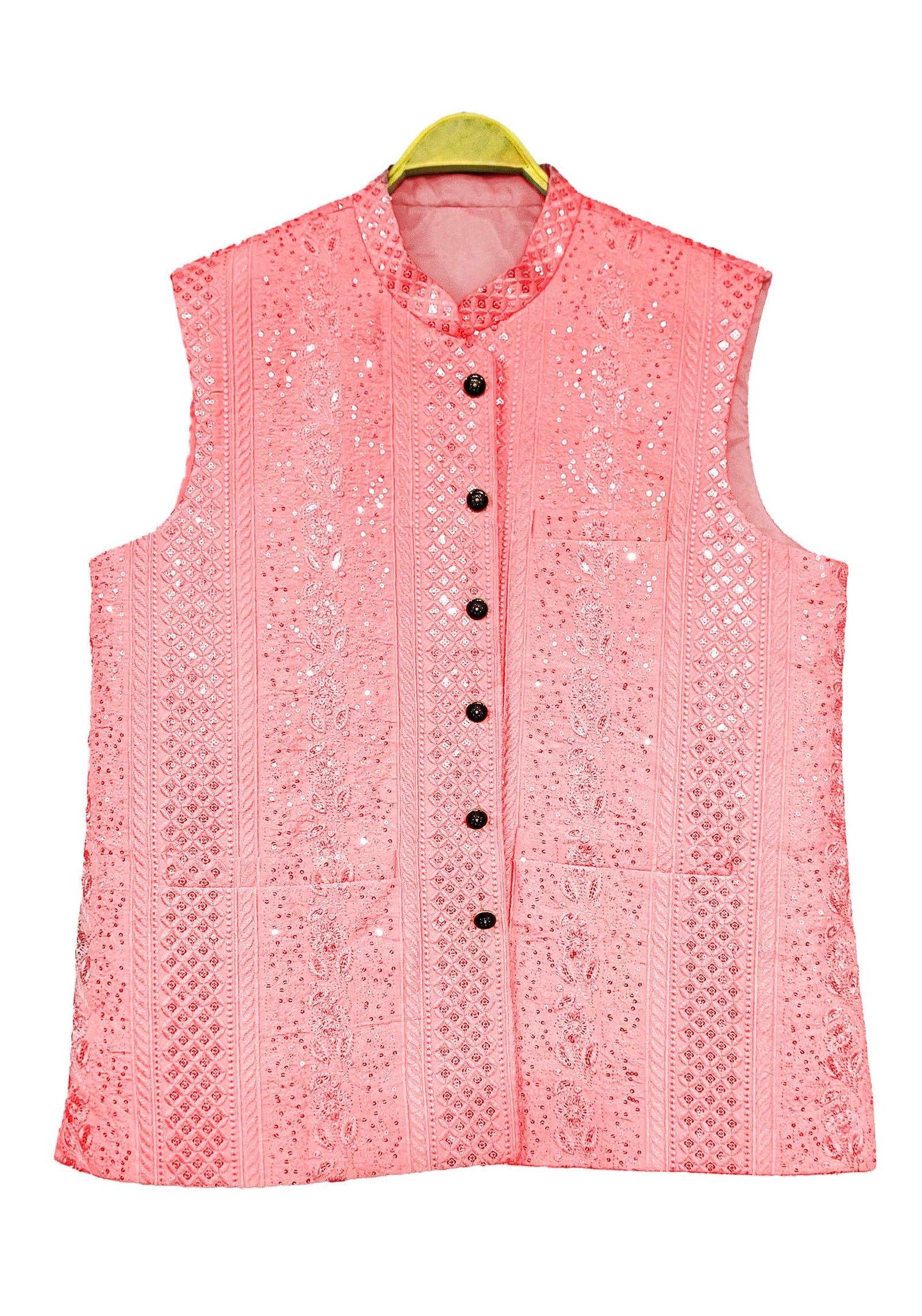 Add a vibrant touch to your festive wardrobe with this Elegant Pink Embroidered Waistcoat from My Product My Style. Crafted from premium blended silk, it features detailed sequin and thread embroidery arranged in vertical floral and diamond patterns. The Mandarin collar, front button closure, and soft satin inner lining make it a perfect blend of style and comfort. This waistcoat is designed for weddings, festive gatherings, and cultural celebrations, giving you a sharp and traditional look.