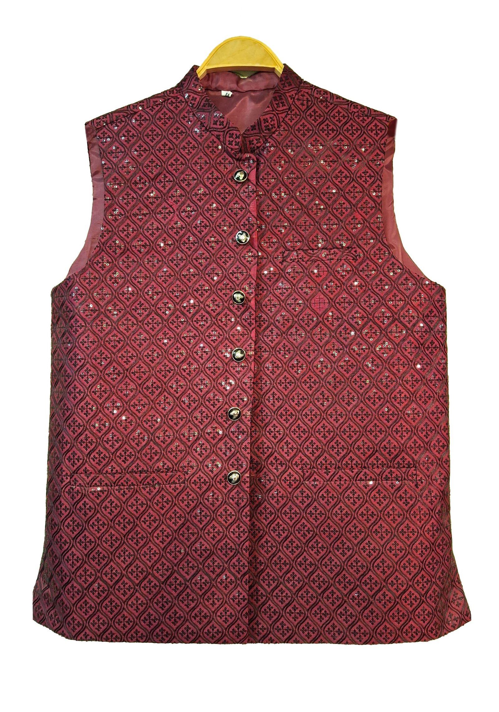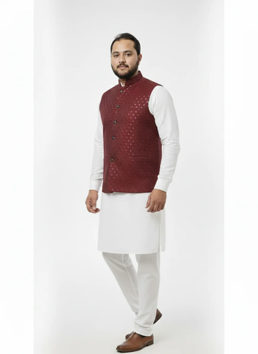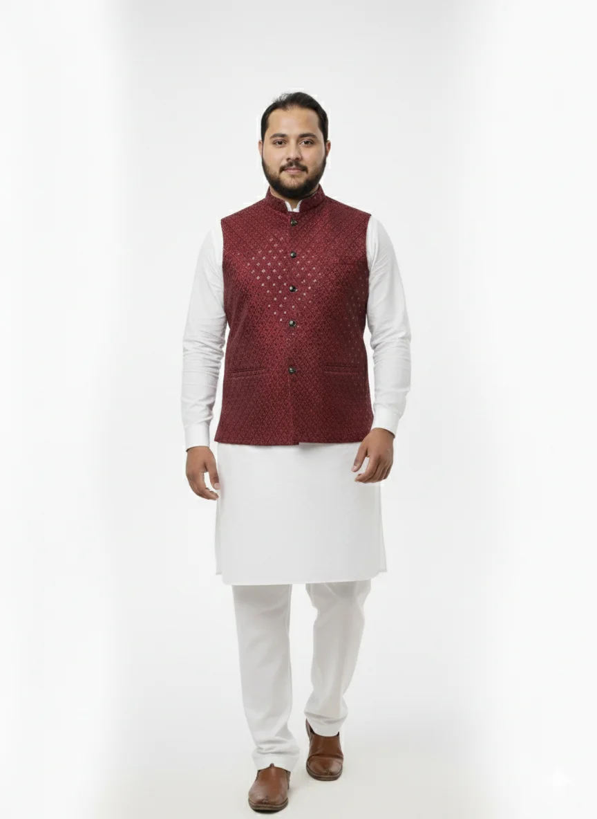 Turn tradition into trend with the Style Royal Maroon Waistcoat, designed for men who appreciate refined ethnic fashion. This elegant piece showcases a rich maroon base adorned with intricate black threadwork and sequin accents in a classic diamond motif, delivering a bold yet graceful look.