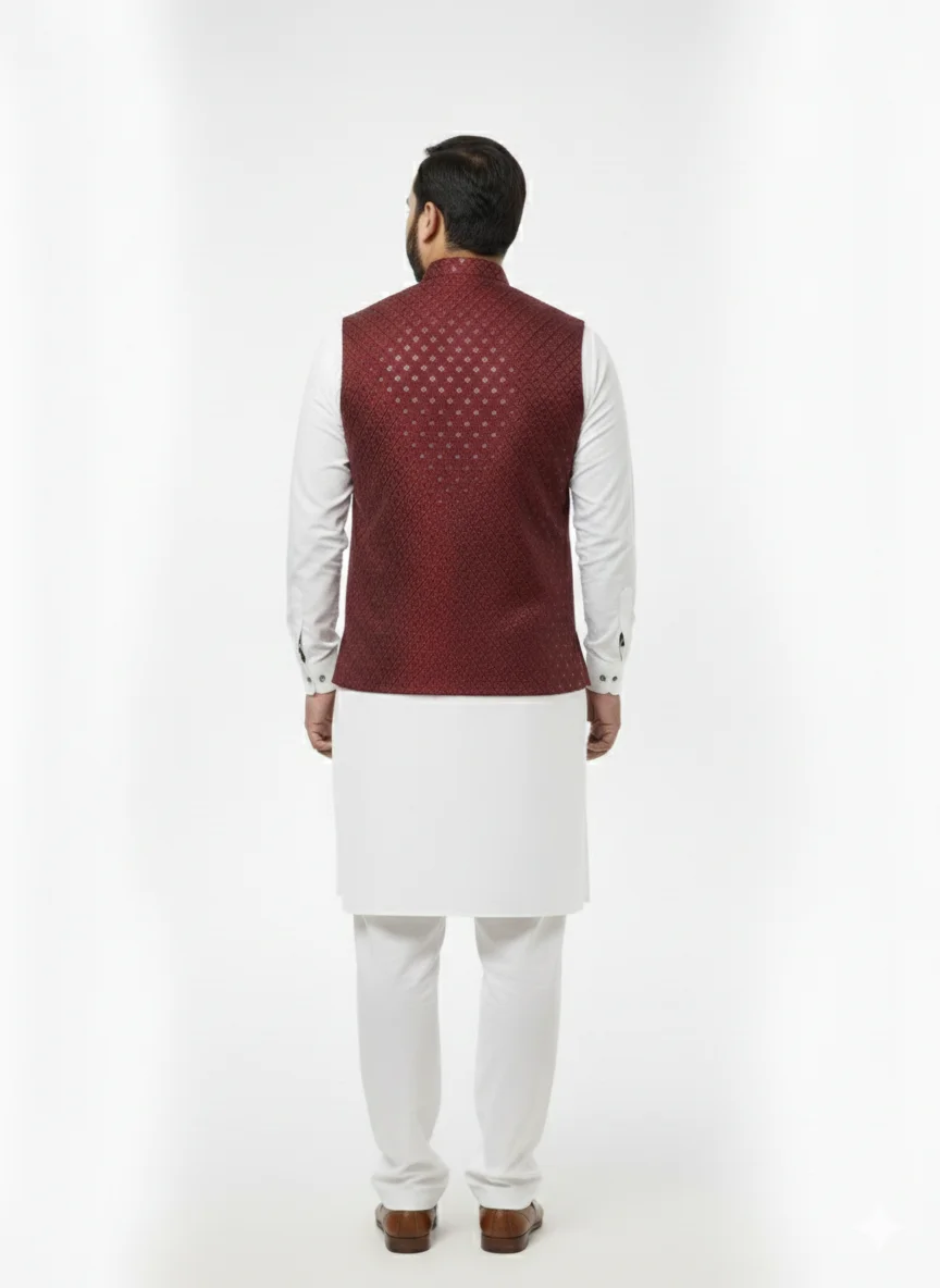 With its structured silhouette, smooth inner lining, and eye-catching metallic buttons, itβs ideal for any festive occasion. Whether worn over a kurta-pajama or shalwar kameez, this waistcoat adds instant regal charm to your outfit.
