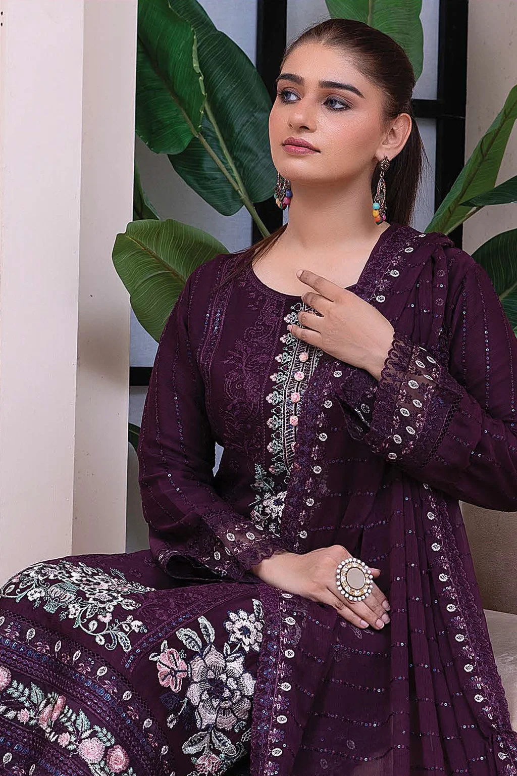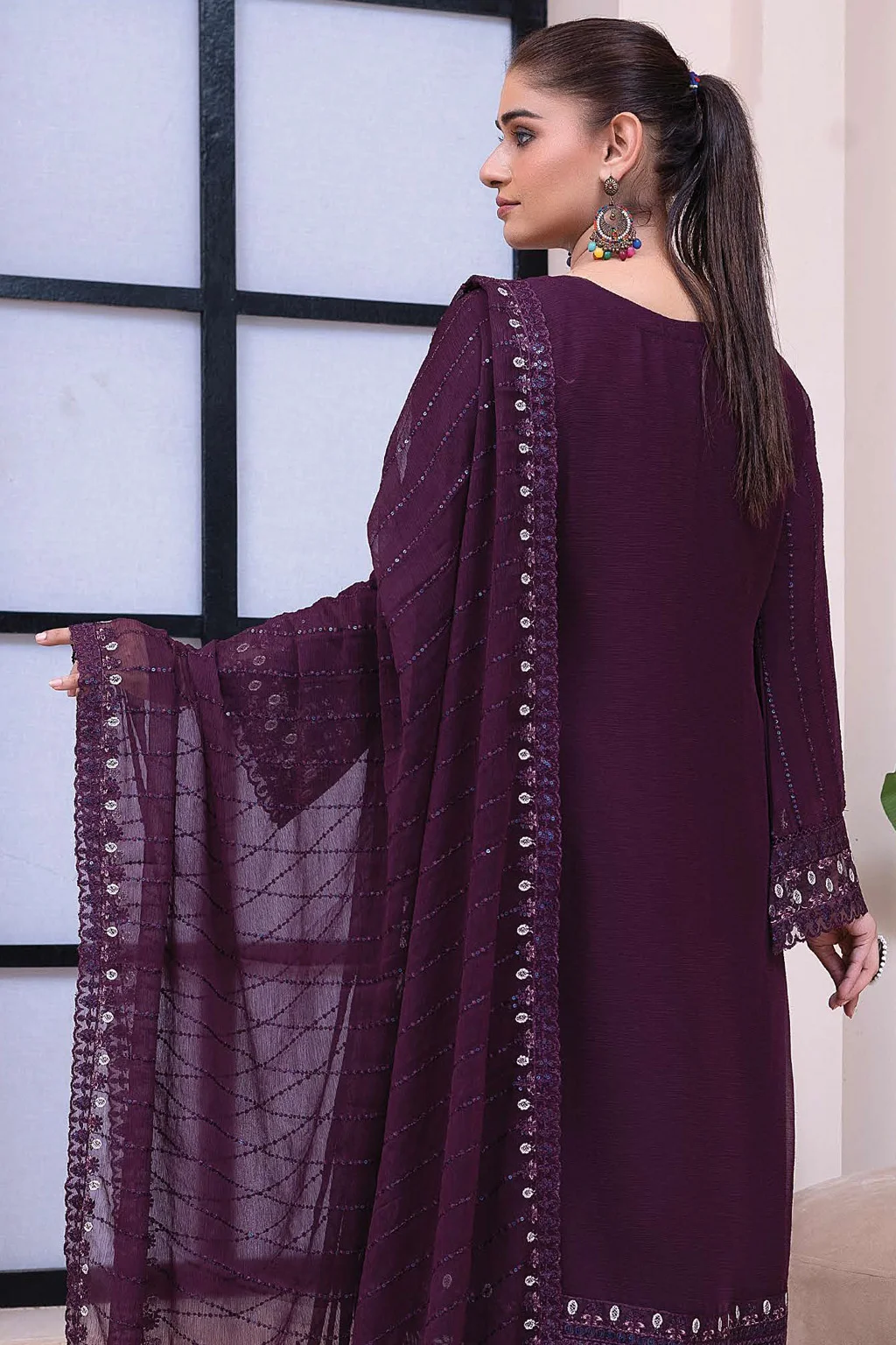 Indulge in the rich elegance of this 3-piece deep plum chiffon outfit. The shirt features intricate thread embroidery and sequin accents, artistically arranged in floral and geometric patterns along the neckline, hem, and sleeves. The wide-leg trousers echo the embroidered motif with matching embellishments. A sheer dupatta with delicate mirrorwork borders and shimmer detailing adds a touch of drama and movement. Ideal for formal dinners, wedding events, and festive gatherings.