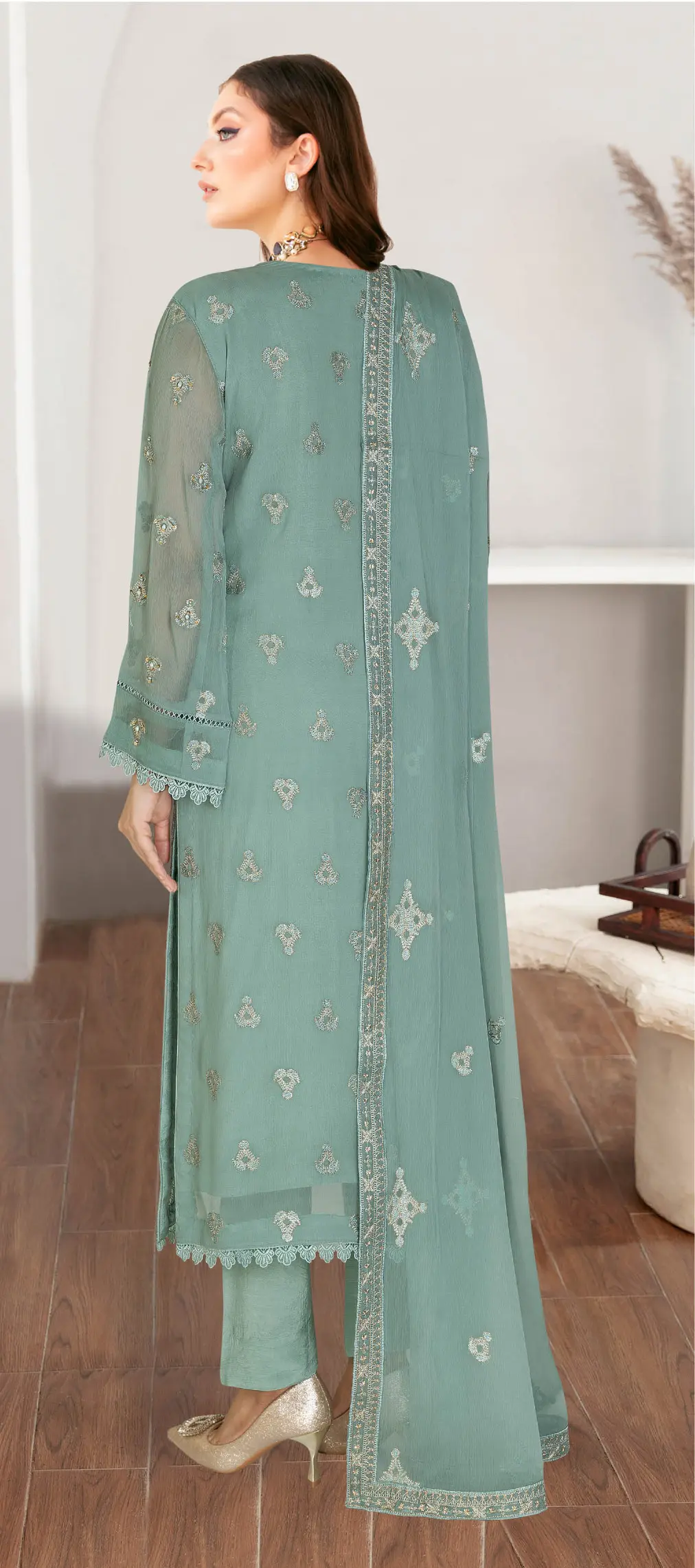 Ramsha WA-495 in sea green offers a refreshing and stylish look. Designed on chiffon with detailed embroidery and paired with a flowy dupatta, this dress is perfect for both day and night events.
