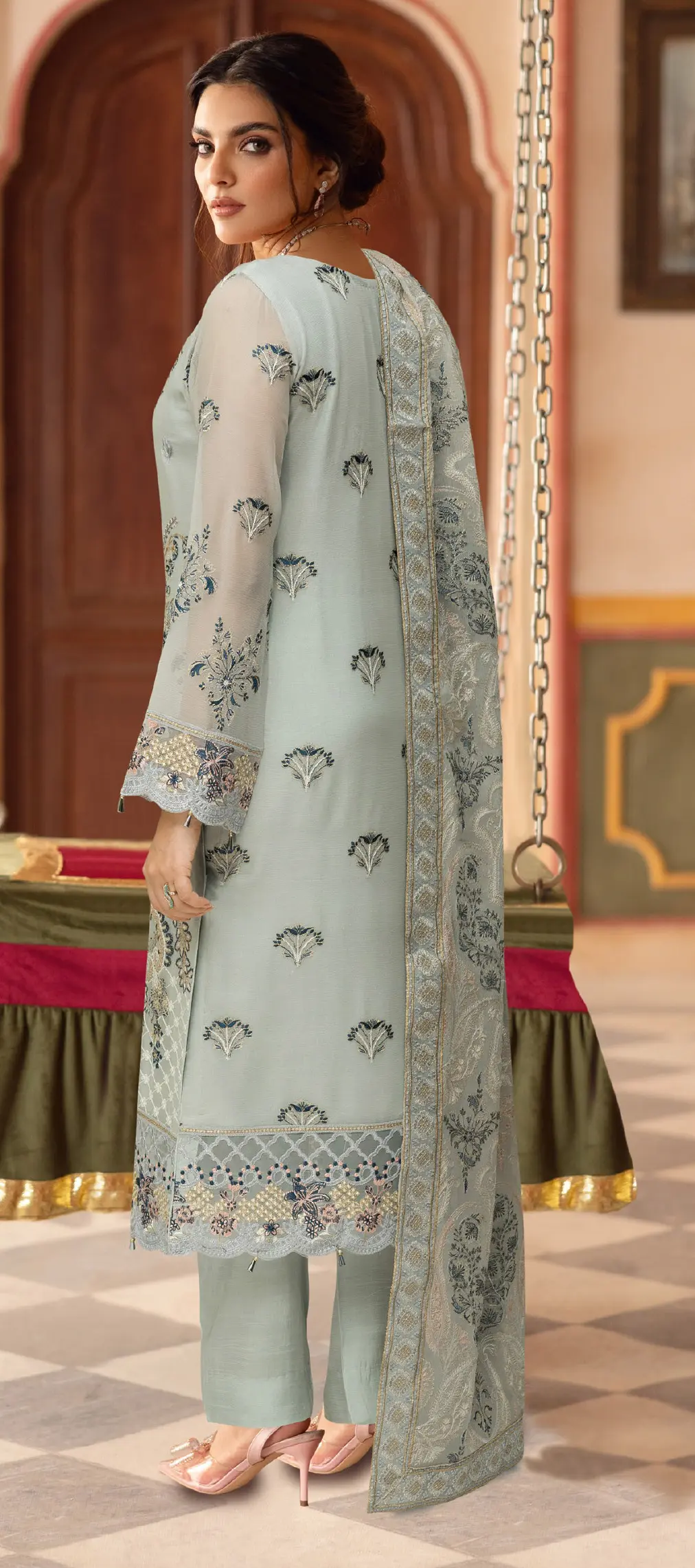 Ramsha WF-514 in light pistachio green is a soft and graceful chiffon outfit designed with intricate embroidery and shimmering sequins. Paired with an embroidered dupatta and matching trouser, this elegant attire is perfect for festive occasions, weddings, and formal evenings.