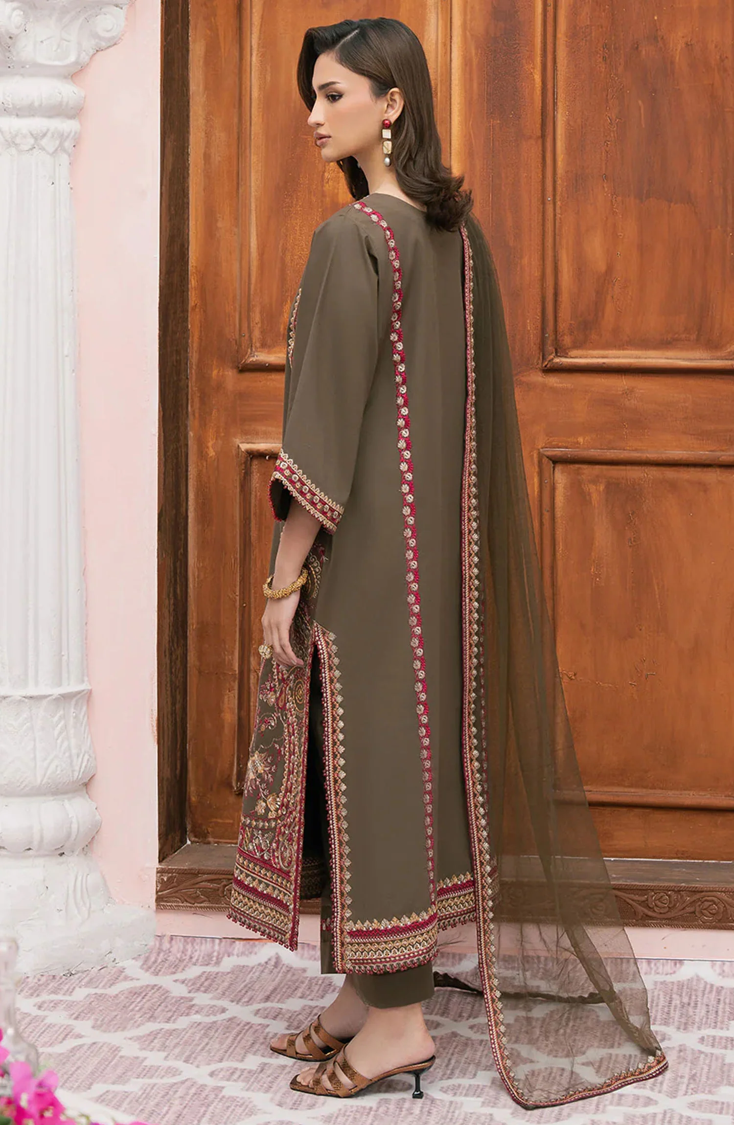 The standard style comes as a long-sleeved kameez with dupatta and trouser/shawlar.