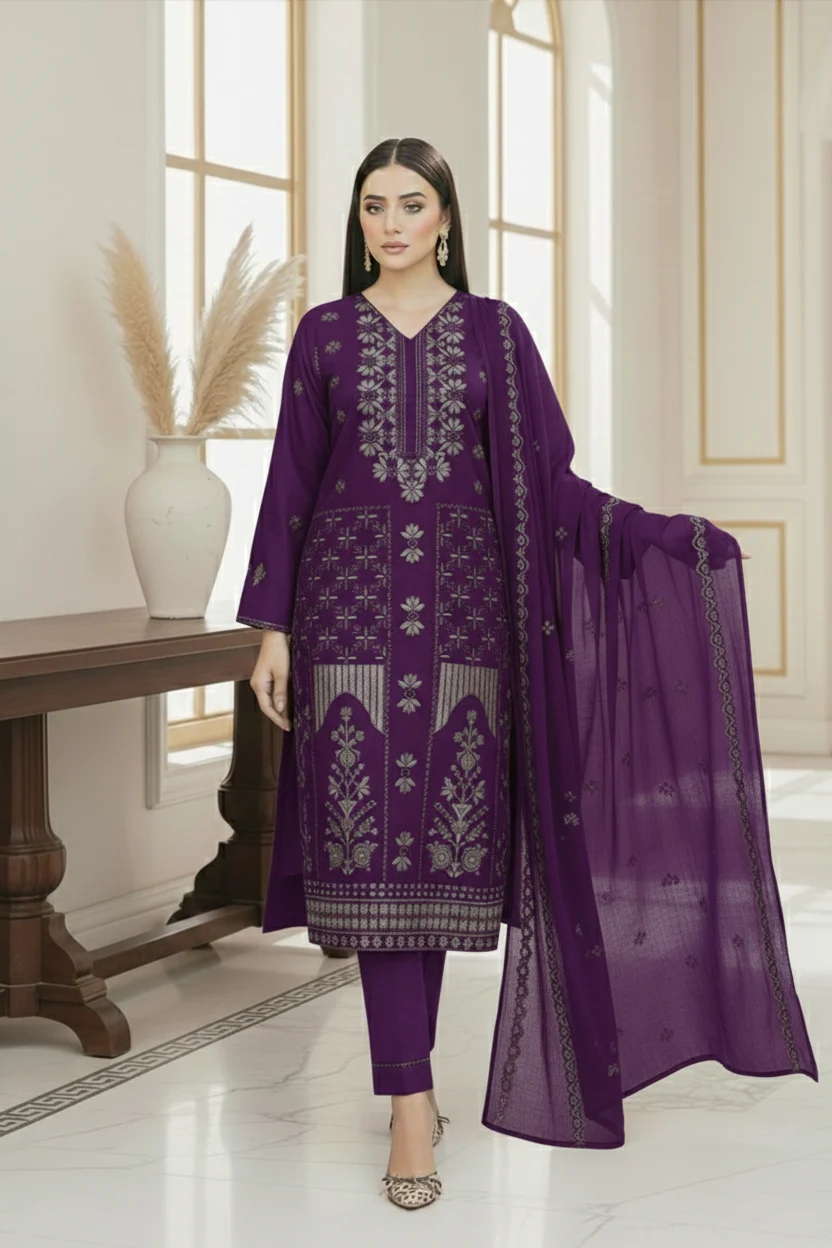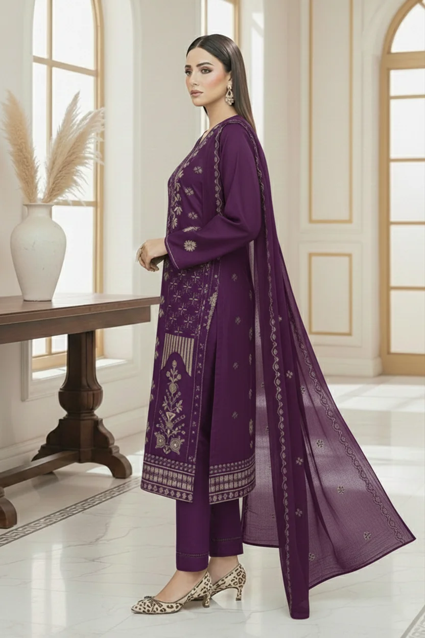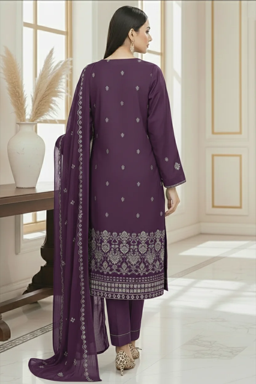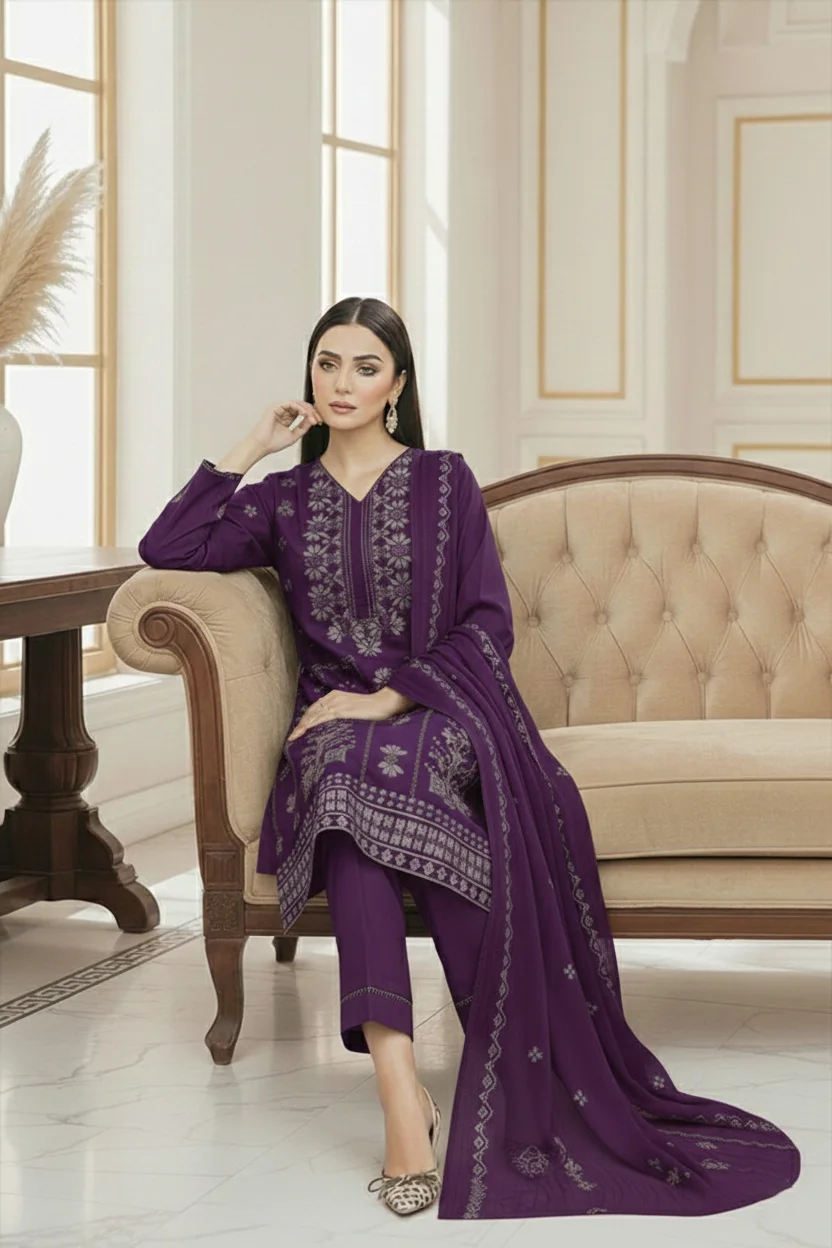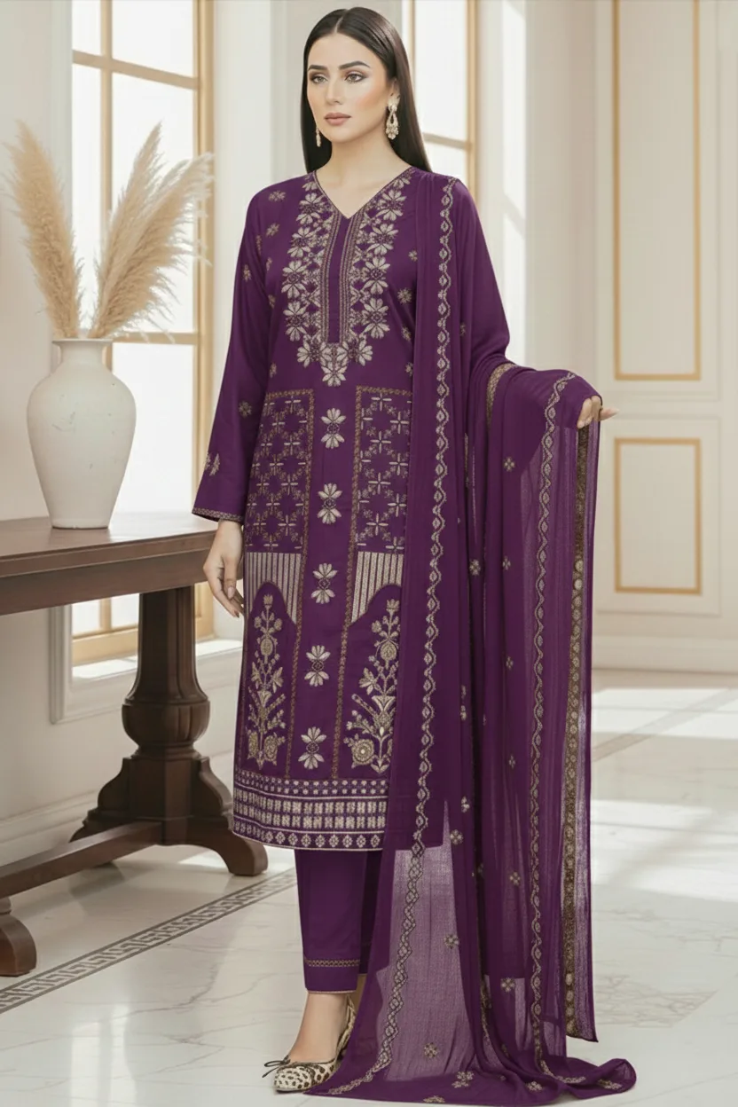 Paired with a beautifully embroidered chiffon dupatta and a plain karandi trouser, this outfit delivers both comfort and sophistication. The royal purple color adds depth and luxury, making it perfect for formal wear, festive occasions, and winter events.