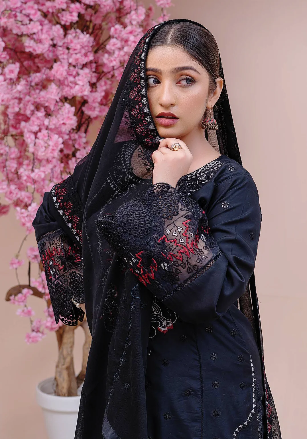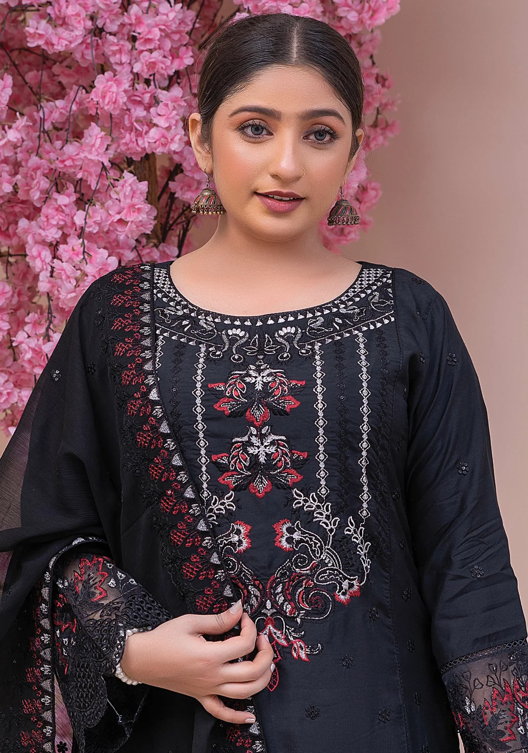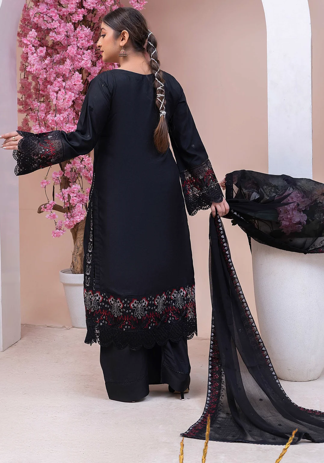 A timeless black embroidered 3-piece suit designed with detailed floral thread embroidery, red and silver tones, and lace finishing. The chiffon dupatta with delicate embroidery completes this graceful festive look.