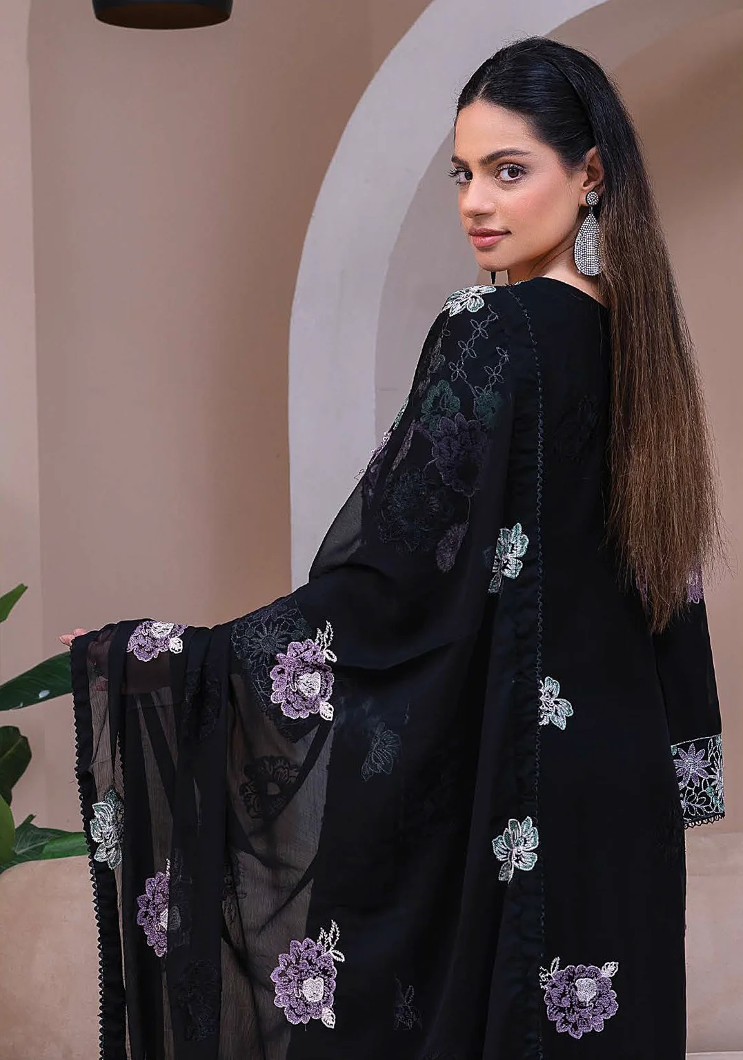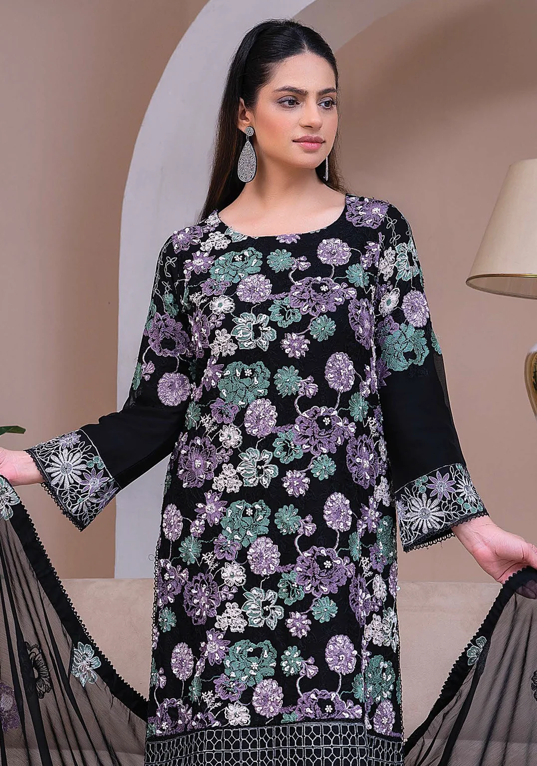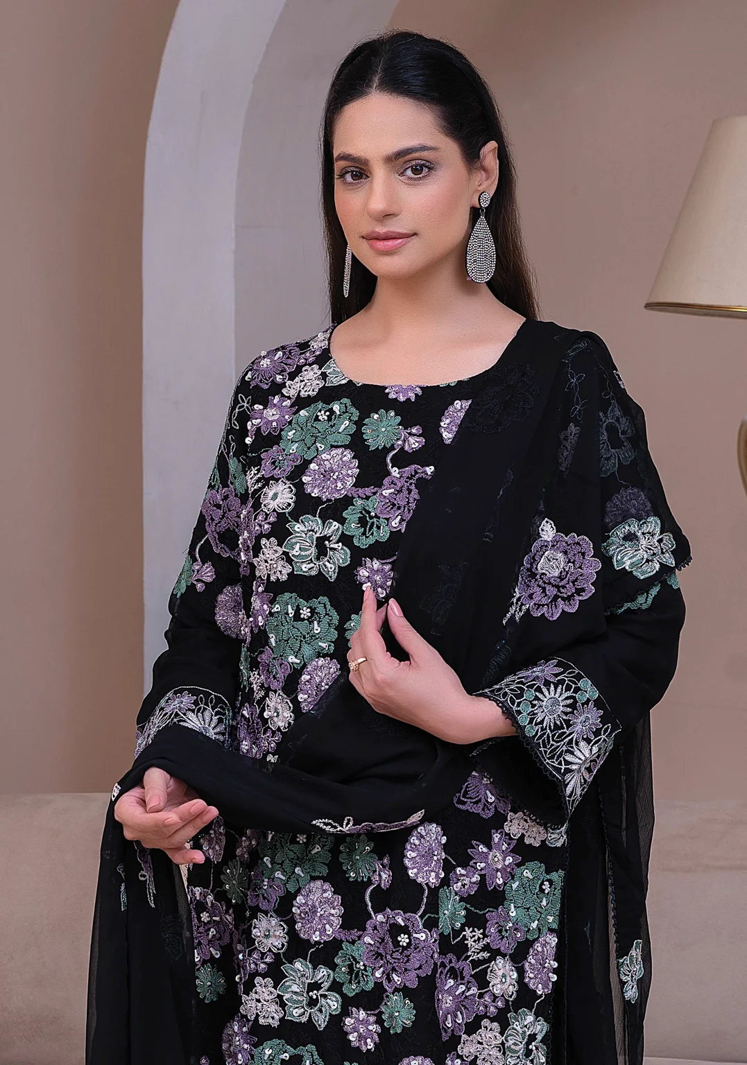 Luxury black embroidered chiffon 3-piece suit with multi-color floral embroidery. Includes embroidered shirt, trouser, and chiffon dupatta. Perfect for weddings & festive events.