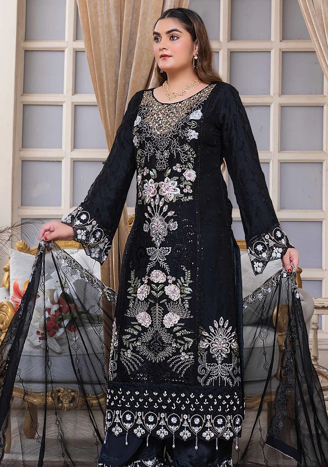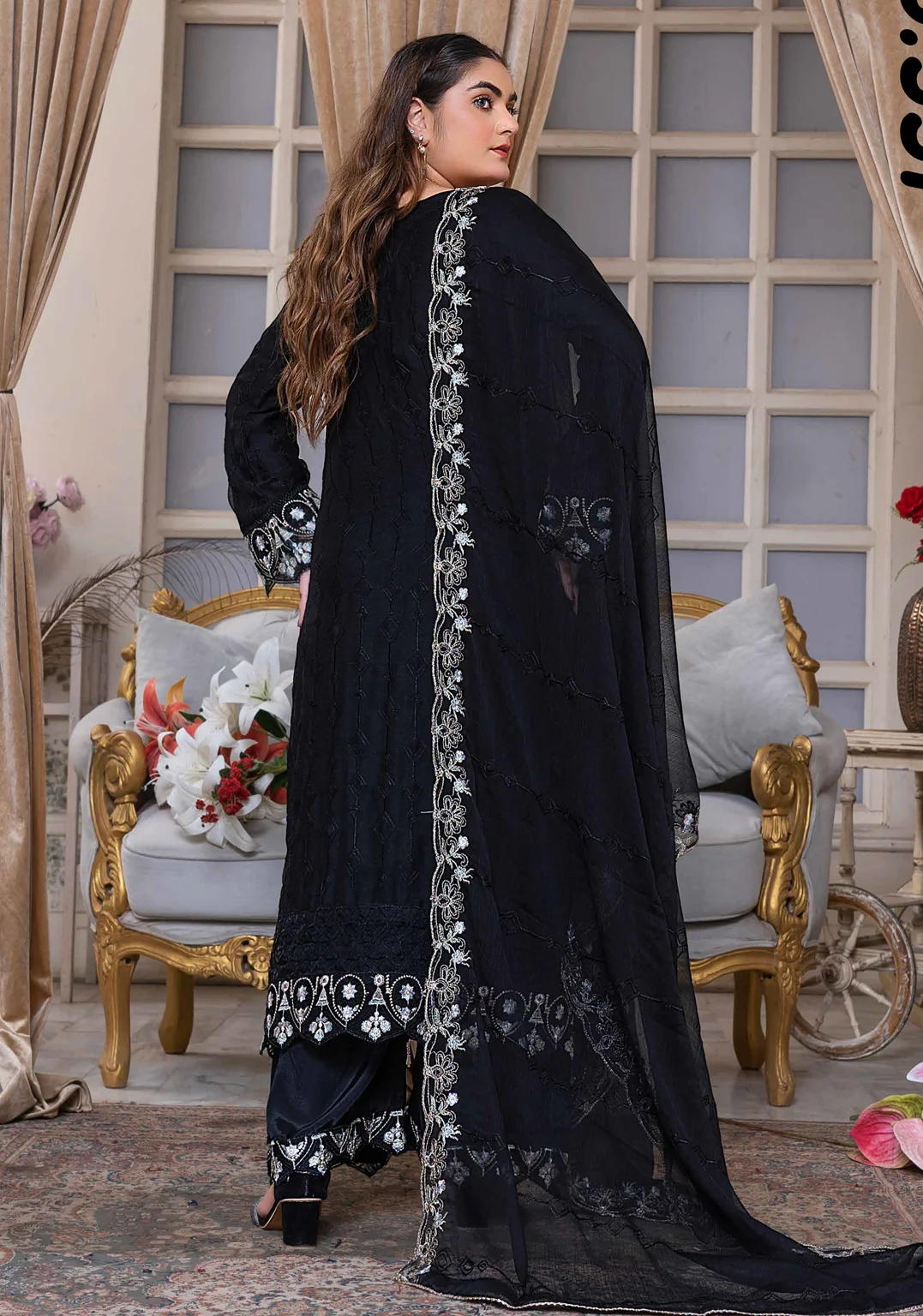 Turn heads with this black embroidered chiffon suit designed with heavy floral and motif embroidery. The long shirt and embroidered dupatta create a bold and graceful look, making it an ideal choice for evening parties and wedding dinners.