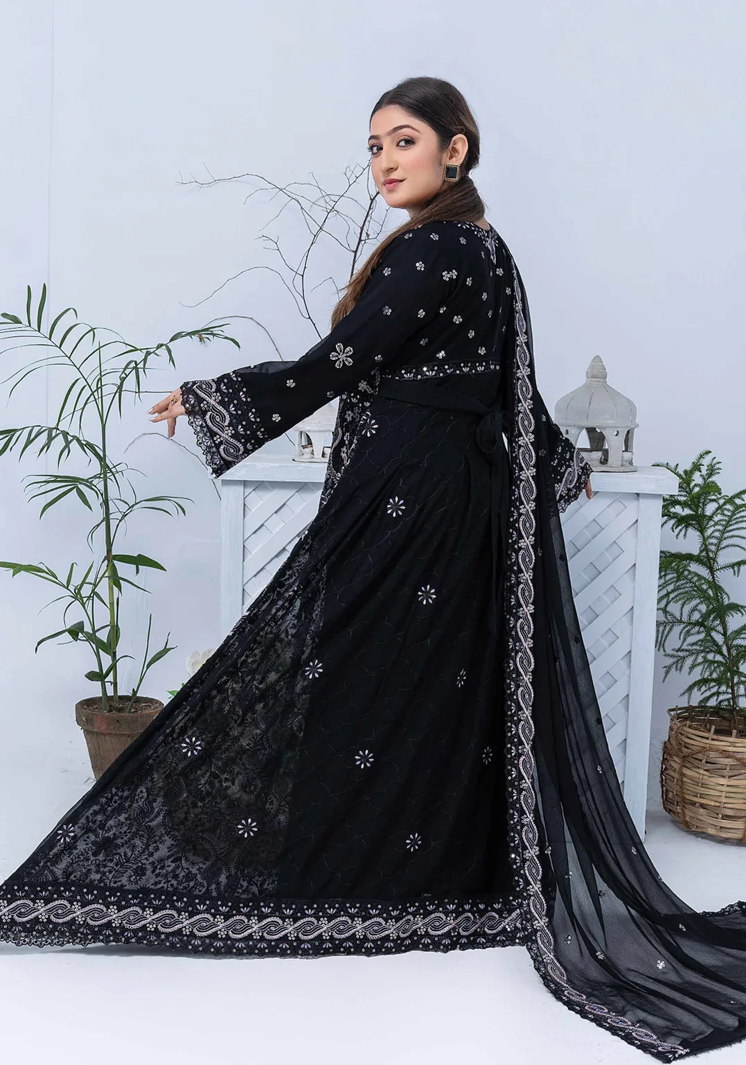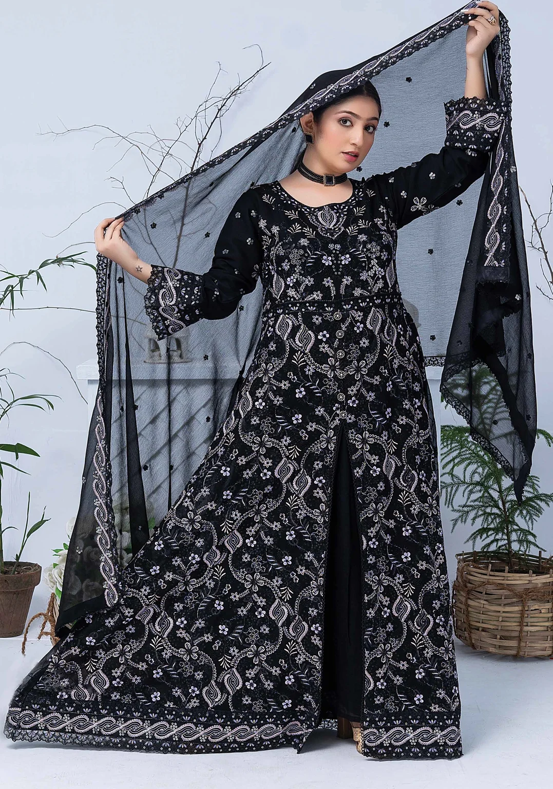 Make a bold statement with this black embroidered maxi suit. Featuring exquisite silver thread embroidery, a stylish long maxi cut, and a matching chiffon dupatta, this outfit is perfect for wedding dinners, evening parties, and Eid celebrations.