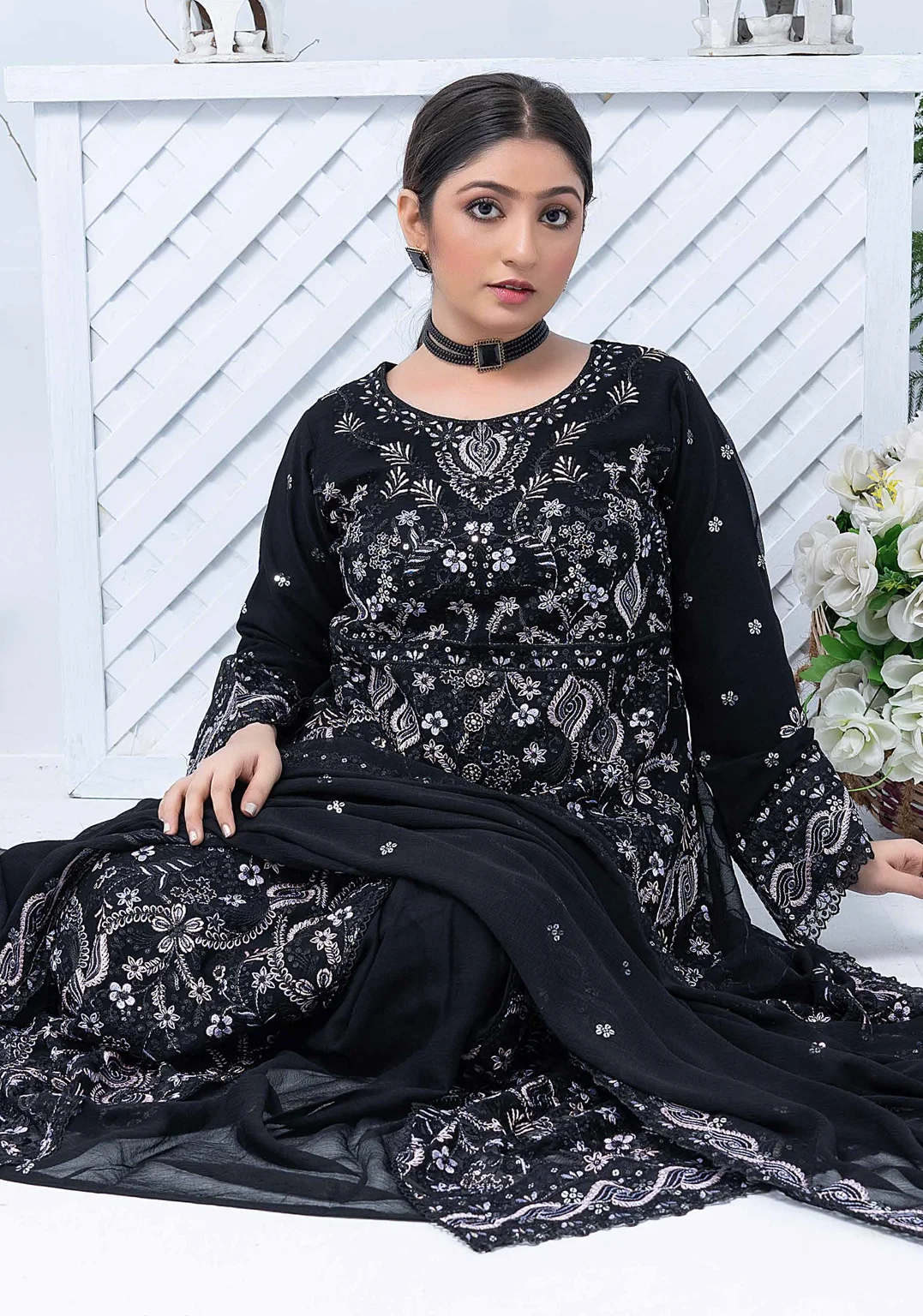Elegant black embroidered maxi suit with chiffon dupatta. Perfect for weddings, evening parties & Eid festive wear. Designer chiffon with luxury embroidery.