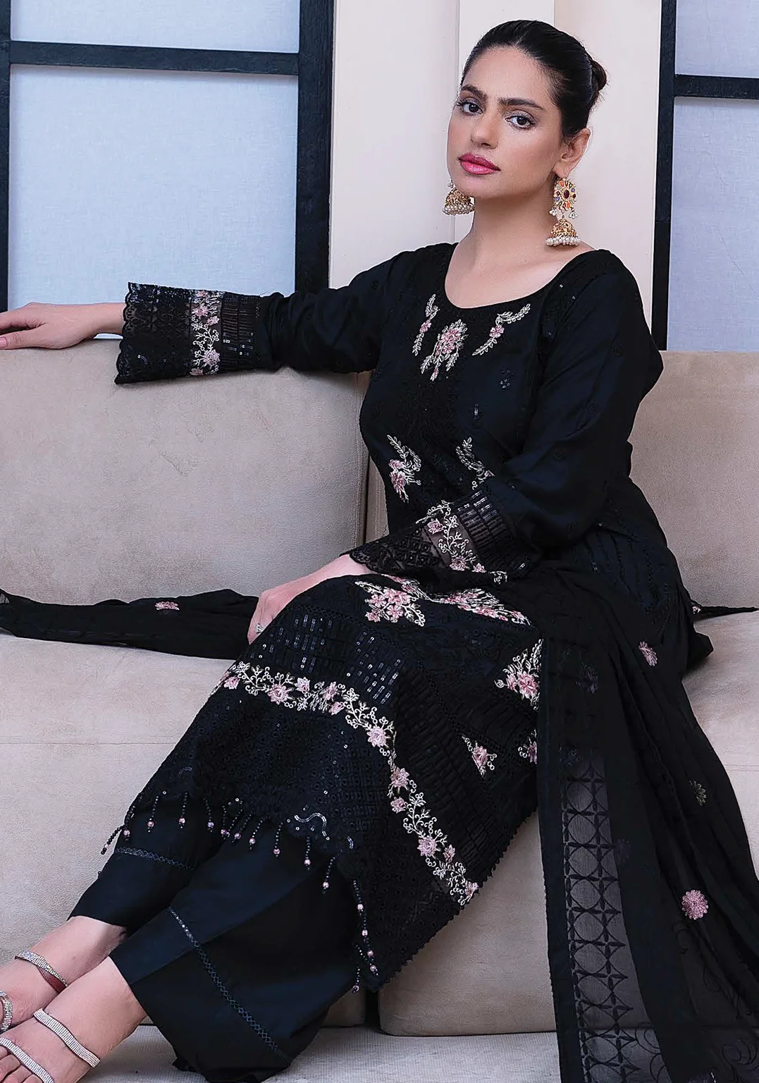 Elevate your style with this classic black embroidered 3-piece suit, a wardrobe essential for every festive occasion. The black shirt is beautifully enhanced with pastel floral embroidery, paired with matching trousers and a sheer embroidered chiffon dupatta. A timeless combination of elegance and sophistication.