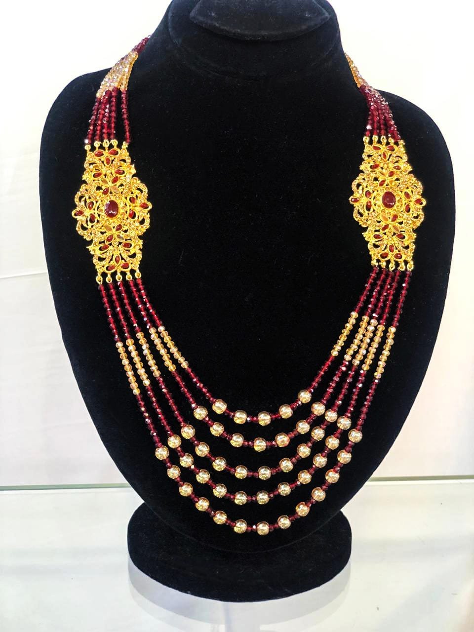 • Design: Multi-strand beaded necklace in red and gold tones