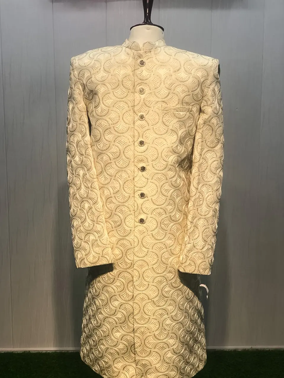 This cream sherwani is beautifully enhanced with golden embroidery in a unique textured pattern. The elegant design, paired with shiny statement buttons, gives it a sophisticated royal look. Perfect for weddings, receptions, and festive celebrations, this sherwani is an ideal choice for grooms who want a graceful yet standout attire.