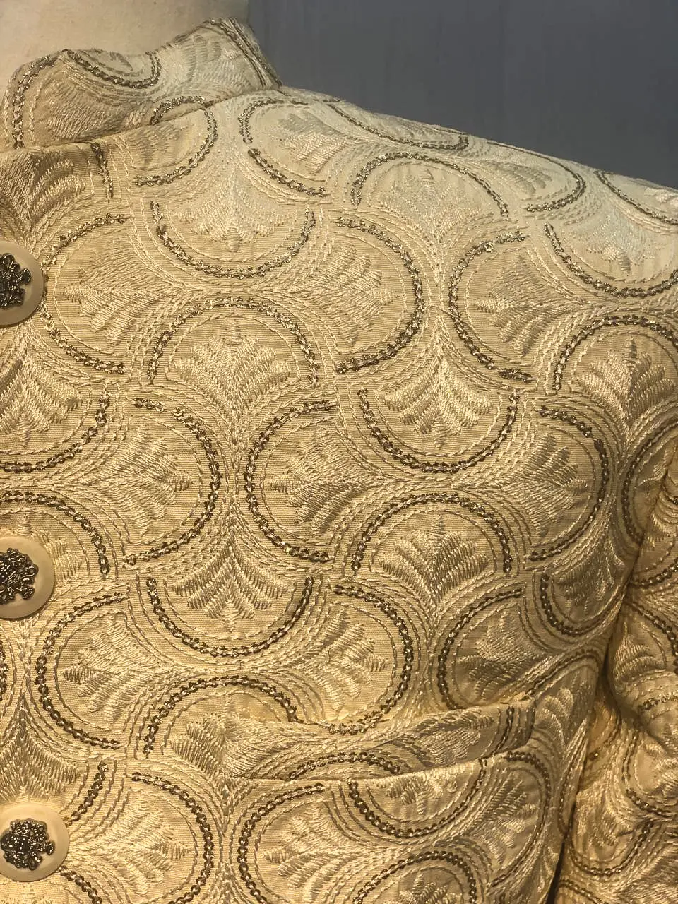Work: Intricate golden embroidery with textured motifs