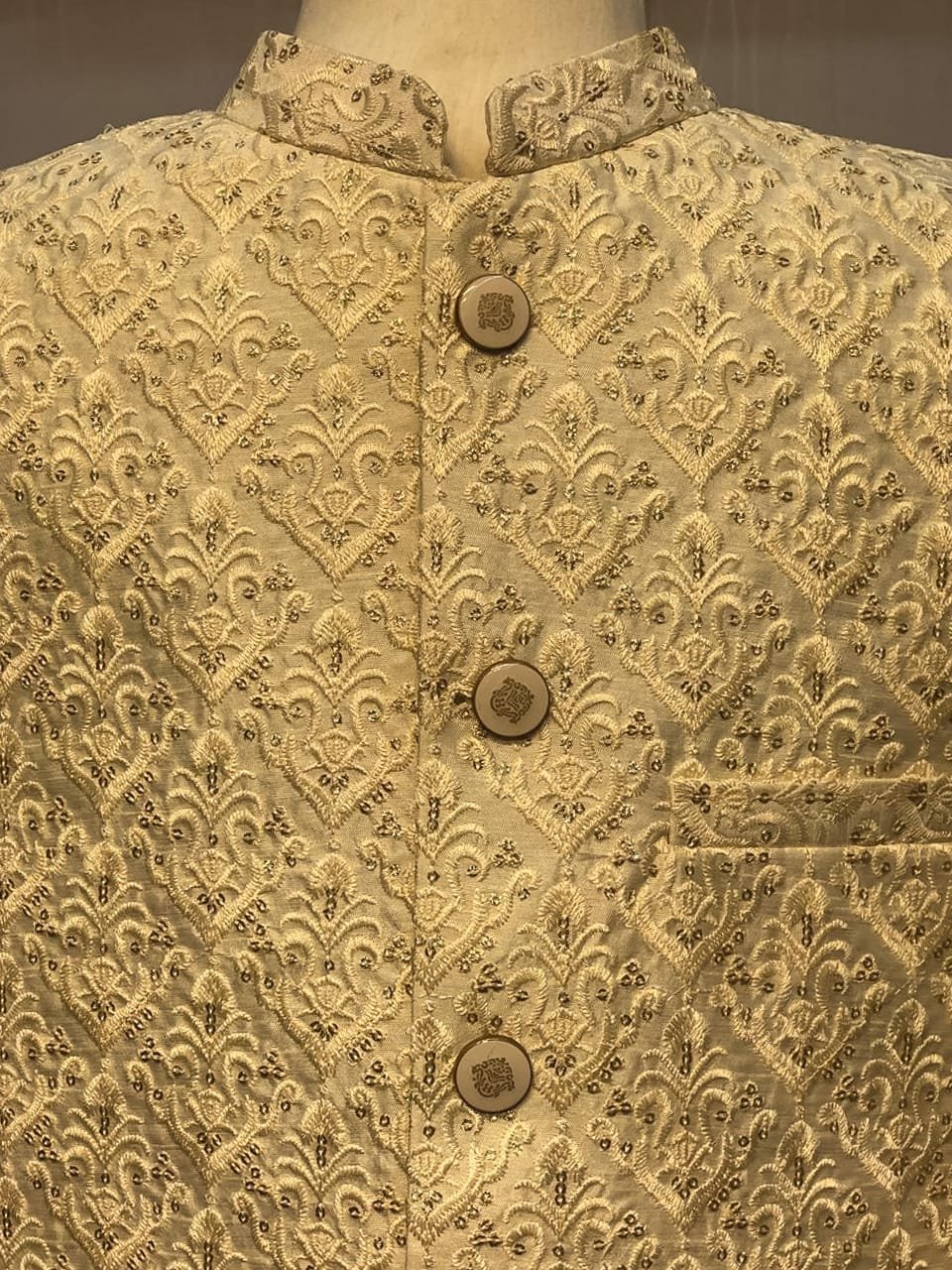 Step into sophistication with this cream textured sherwani, crafted with intricate jacquard embroidery. Designed for grooms and special occasions, it features a royal front-button style with a mandarin collar for a timeless appeal.