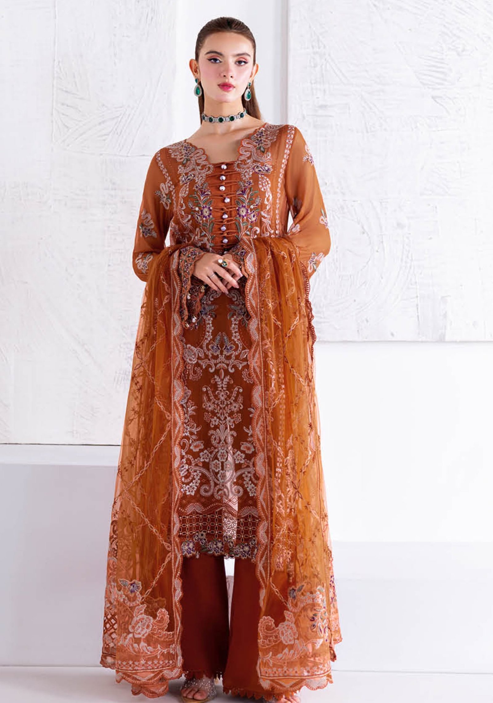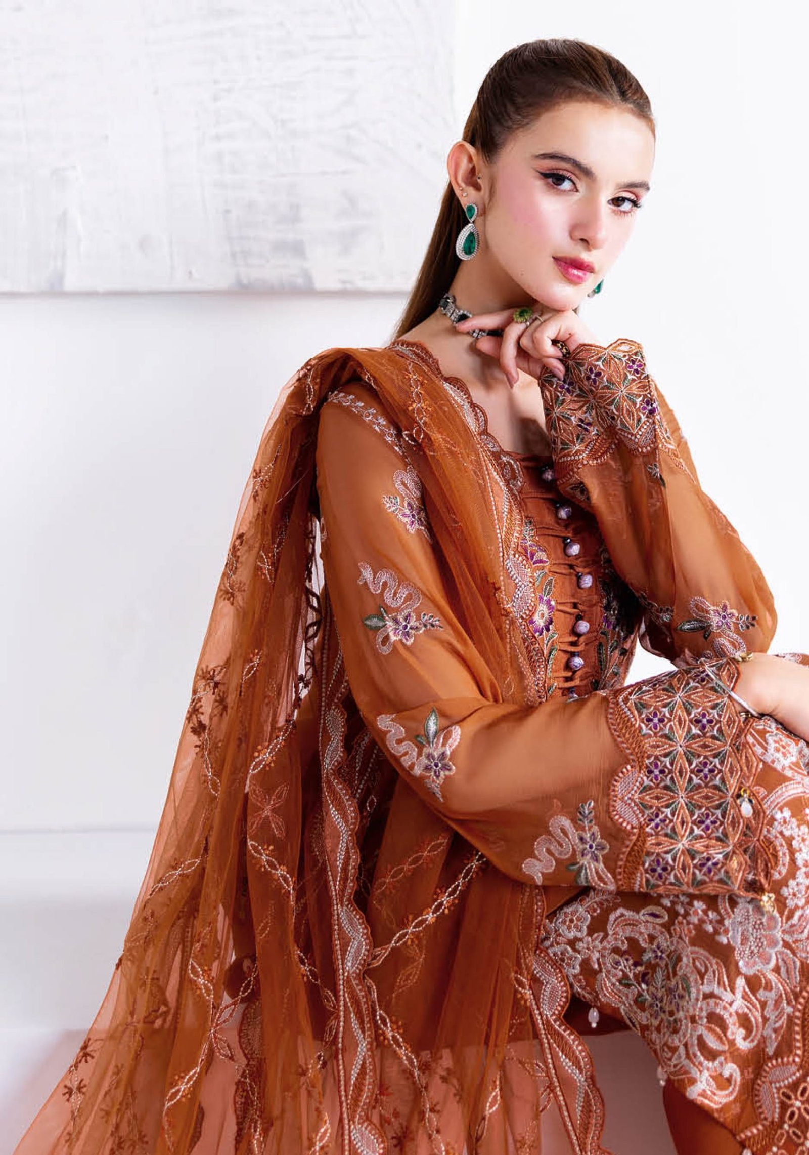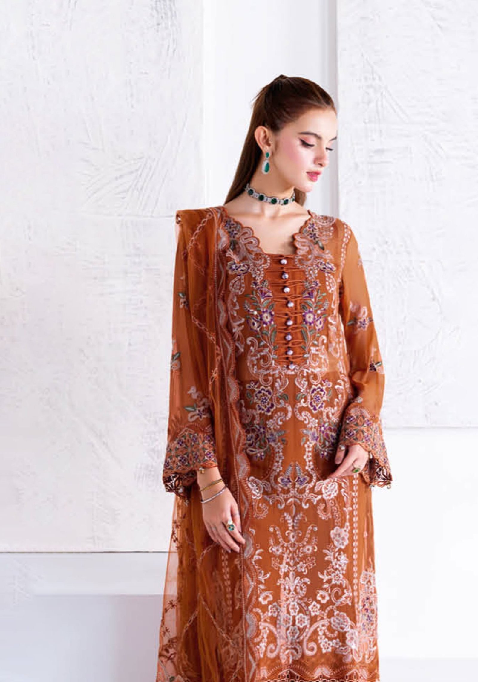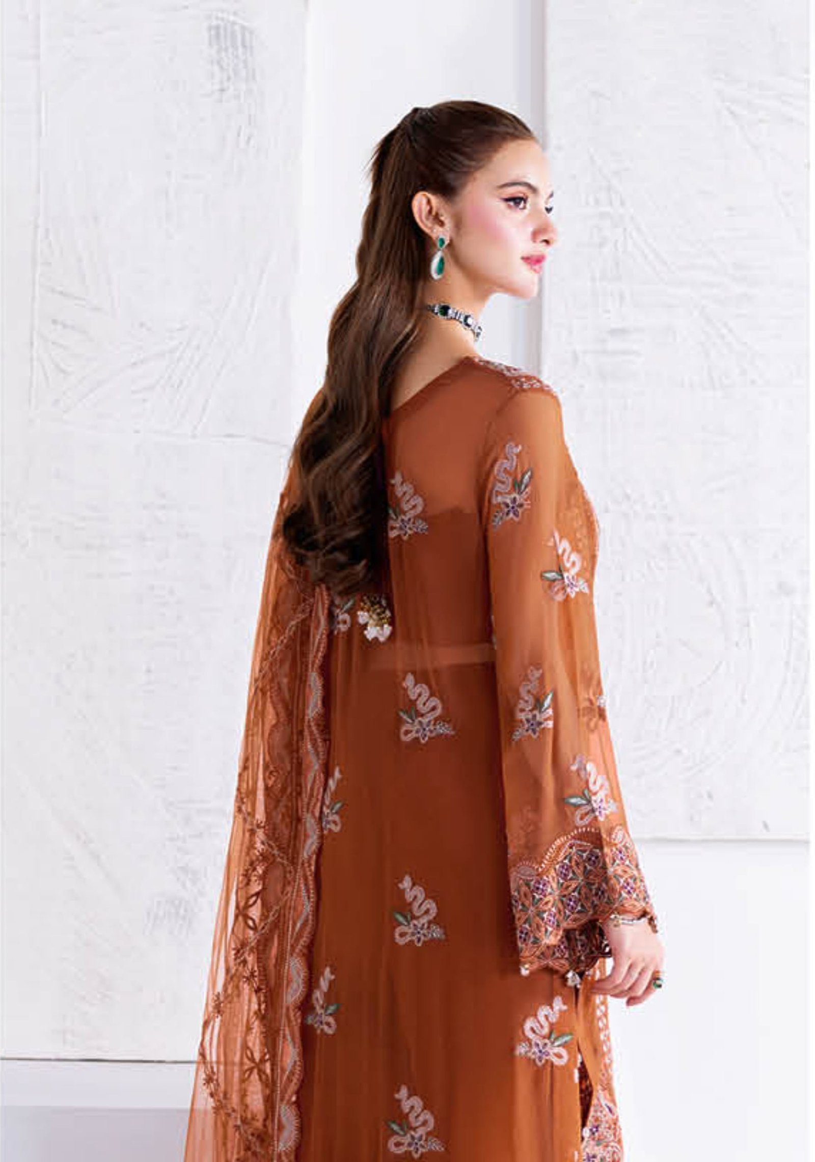Step into elegance with this stunning three-piece embroidered net ensemble in a rich rust hue. Crafted with intricate thread and sequin embroidery, this outfit is the epitome of festive sophistication.