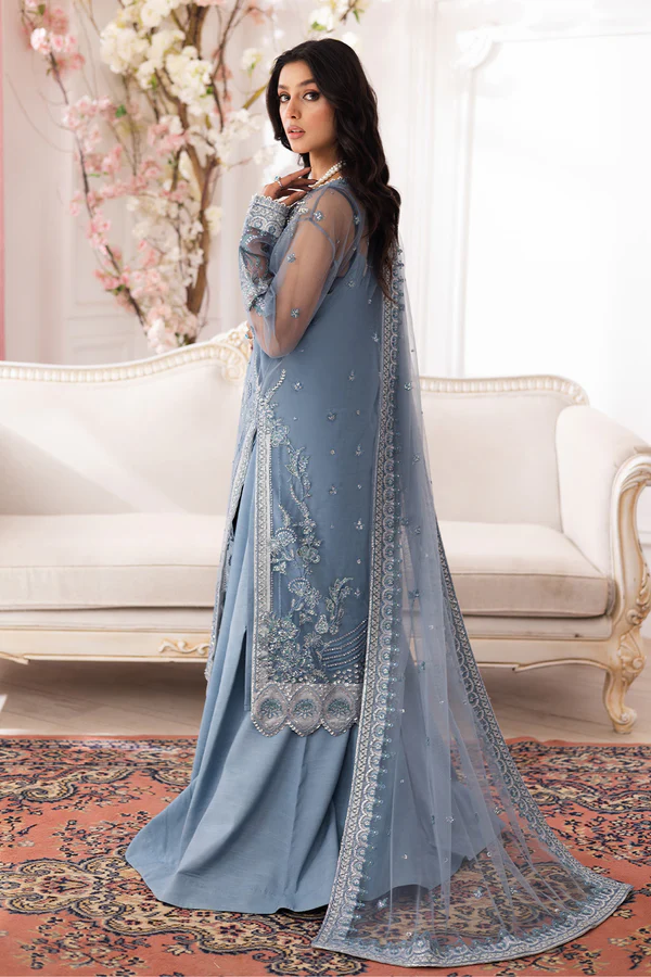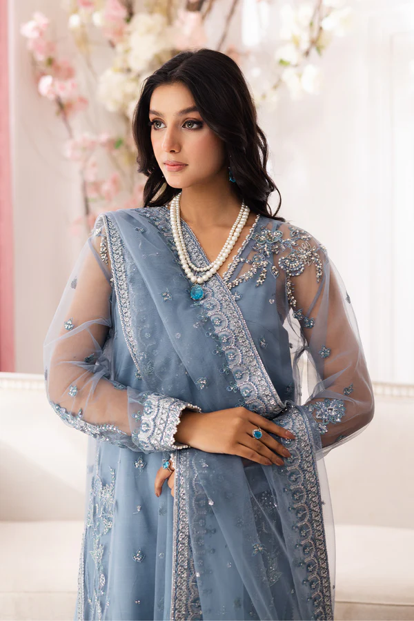 Exude timeless charm in this 3-piece suit in Dusk Blue. The intricately designed net shirt creates an ethereal look, paired with a matching net dupatta for a delicate touch. Finished with sleek grip trousers, this ensemble is the perfect balance of elegance and sophistication.