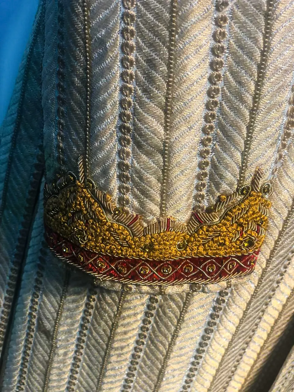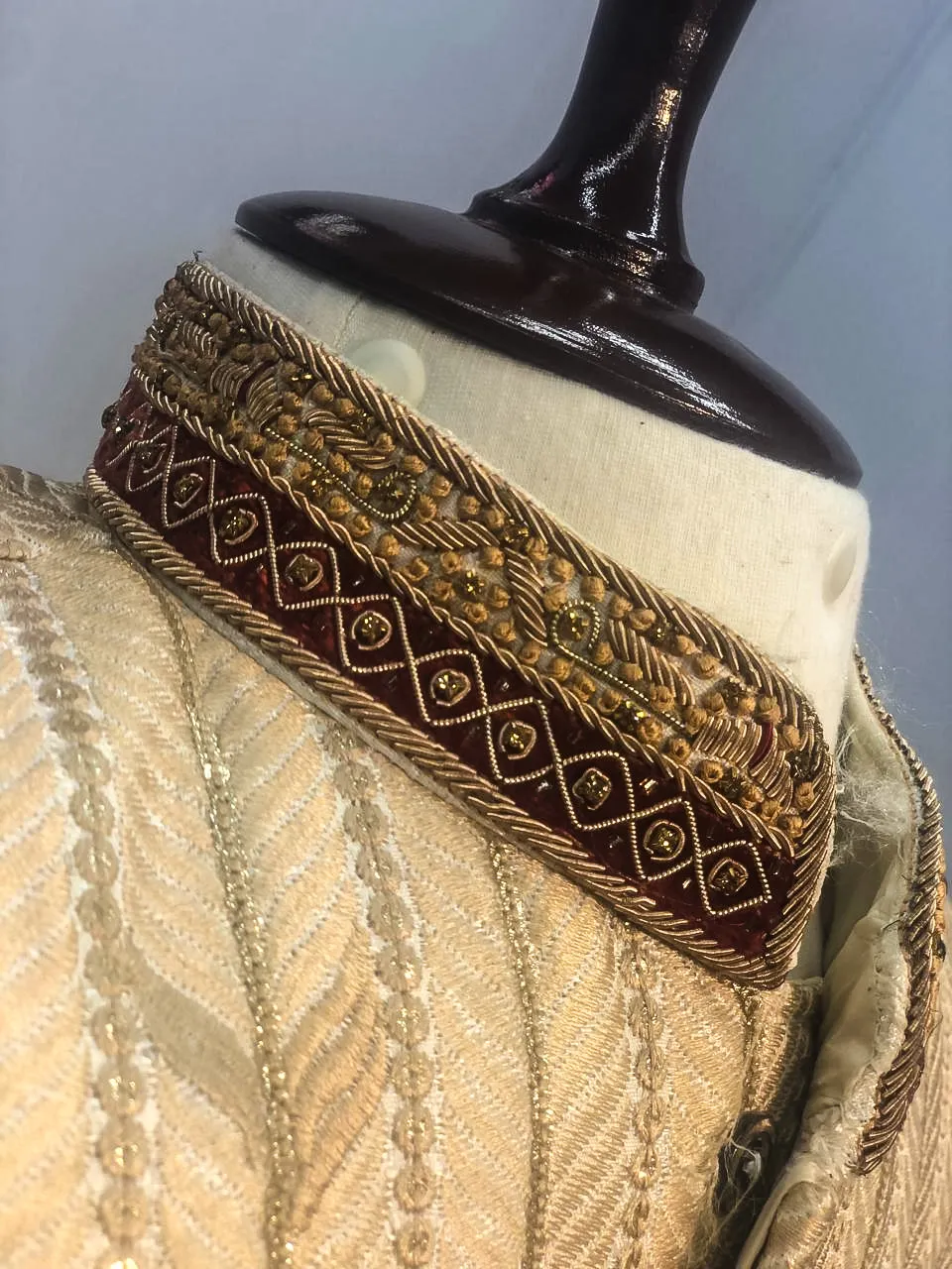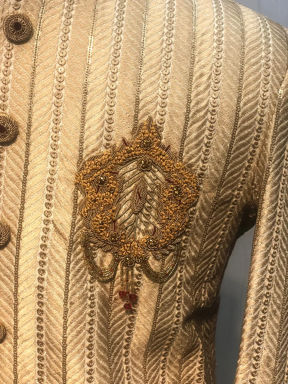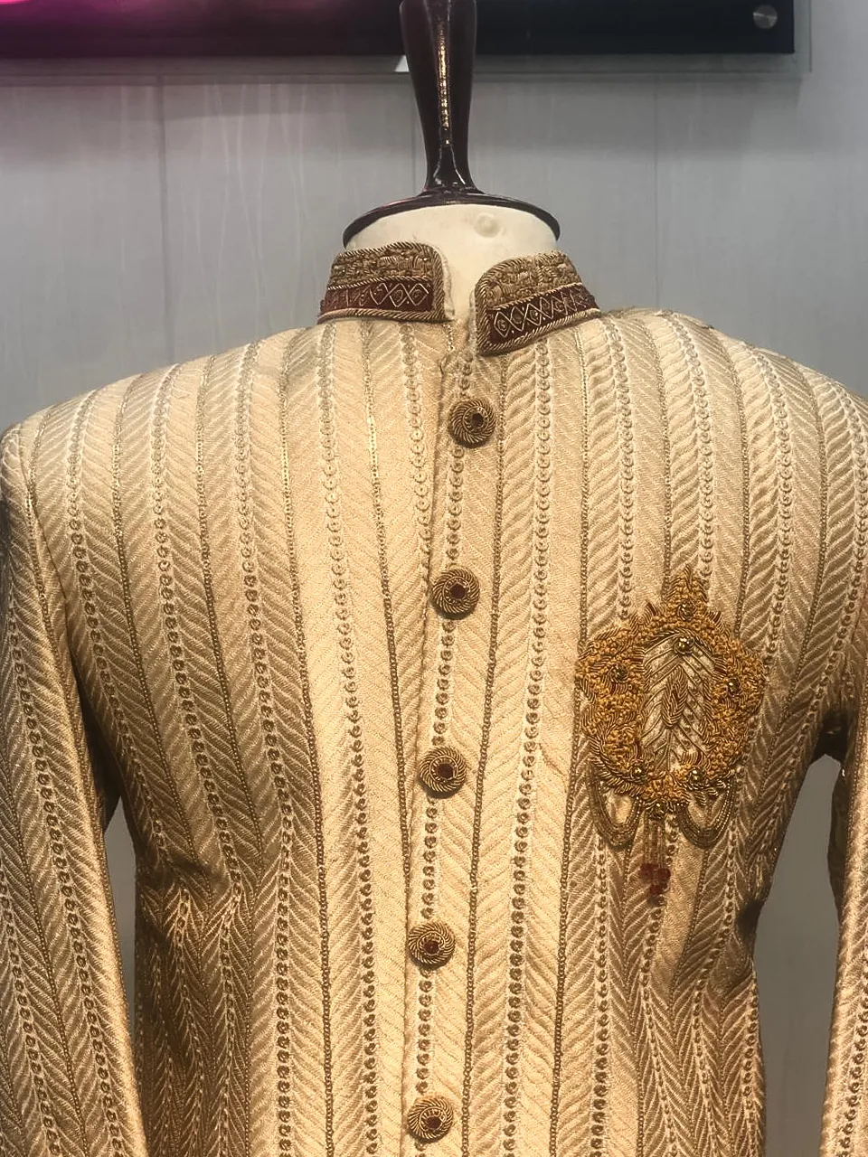 Elevate your wedding style with this golden sherwani, crafted in premium textured fabric and finished with elegant designer buttons. Its royal golden hue radiates luxury and makes it the perfect choice for grooms who want a majestic yet classy look on their big day.