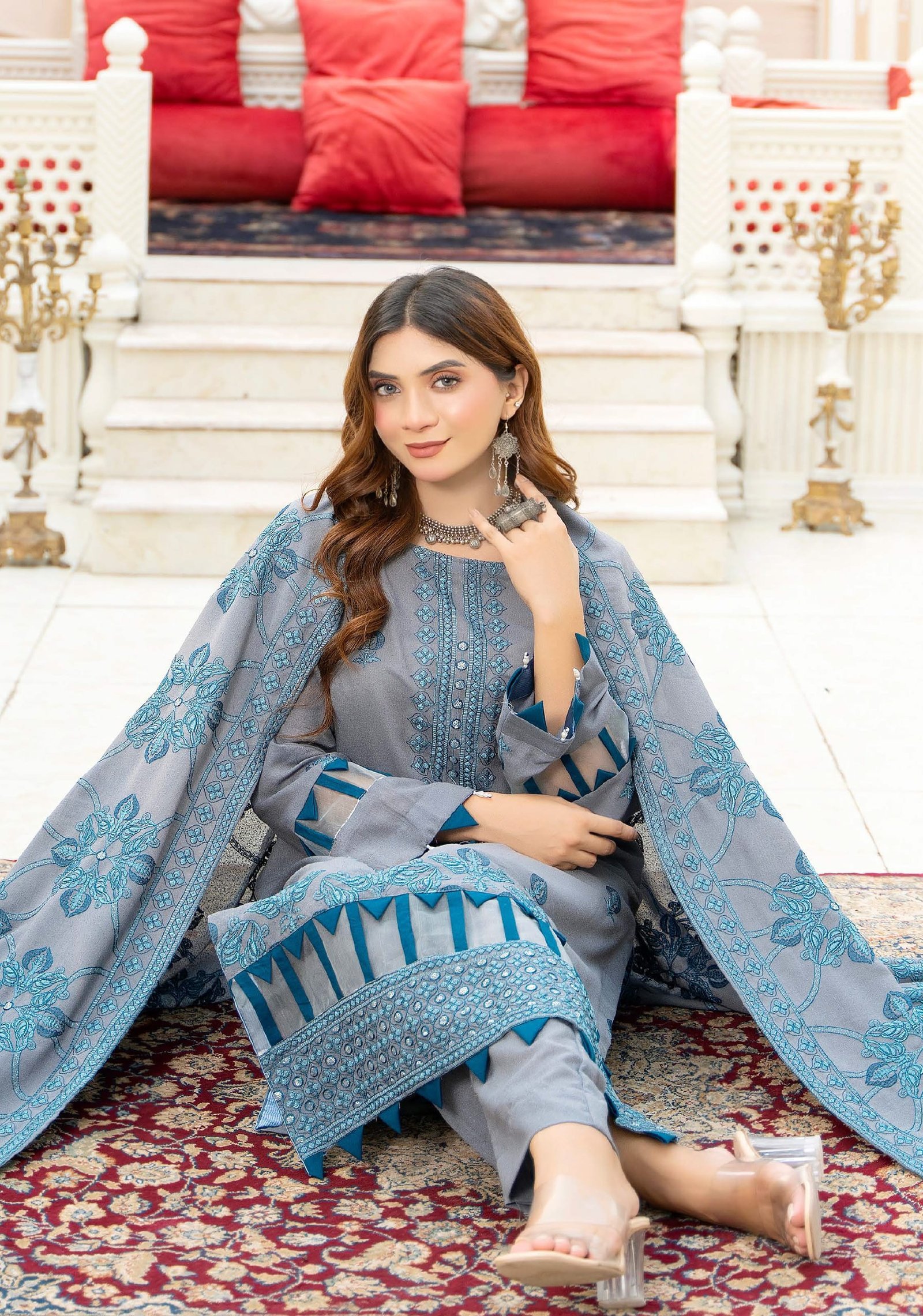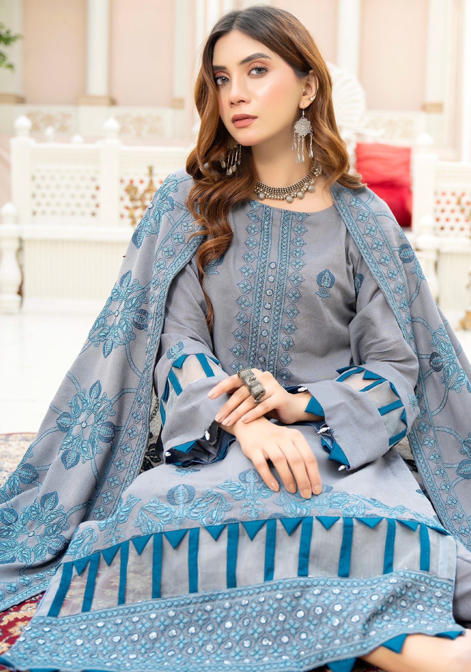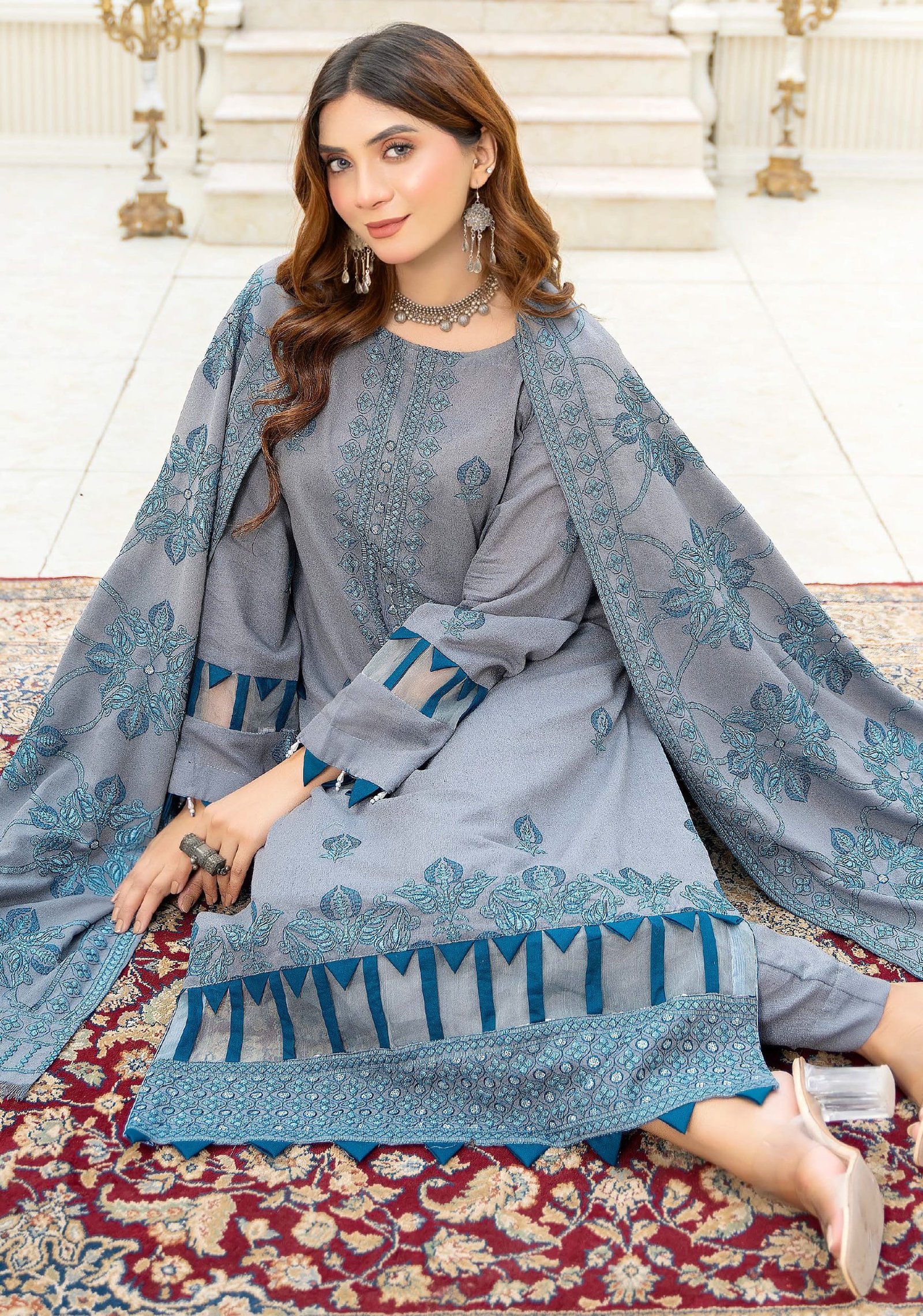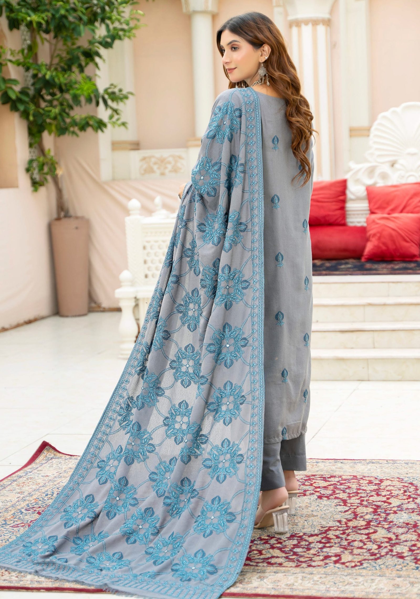 Step into sophisticated elegance with this grey and teal 3-piece embroidered lawn suit, designed for those who appreciate timeless fashion with a modern twist. The cool grey base is elevated with intricate teal thread embroidery, giving it a refined and graceful charm.