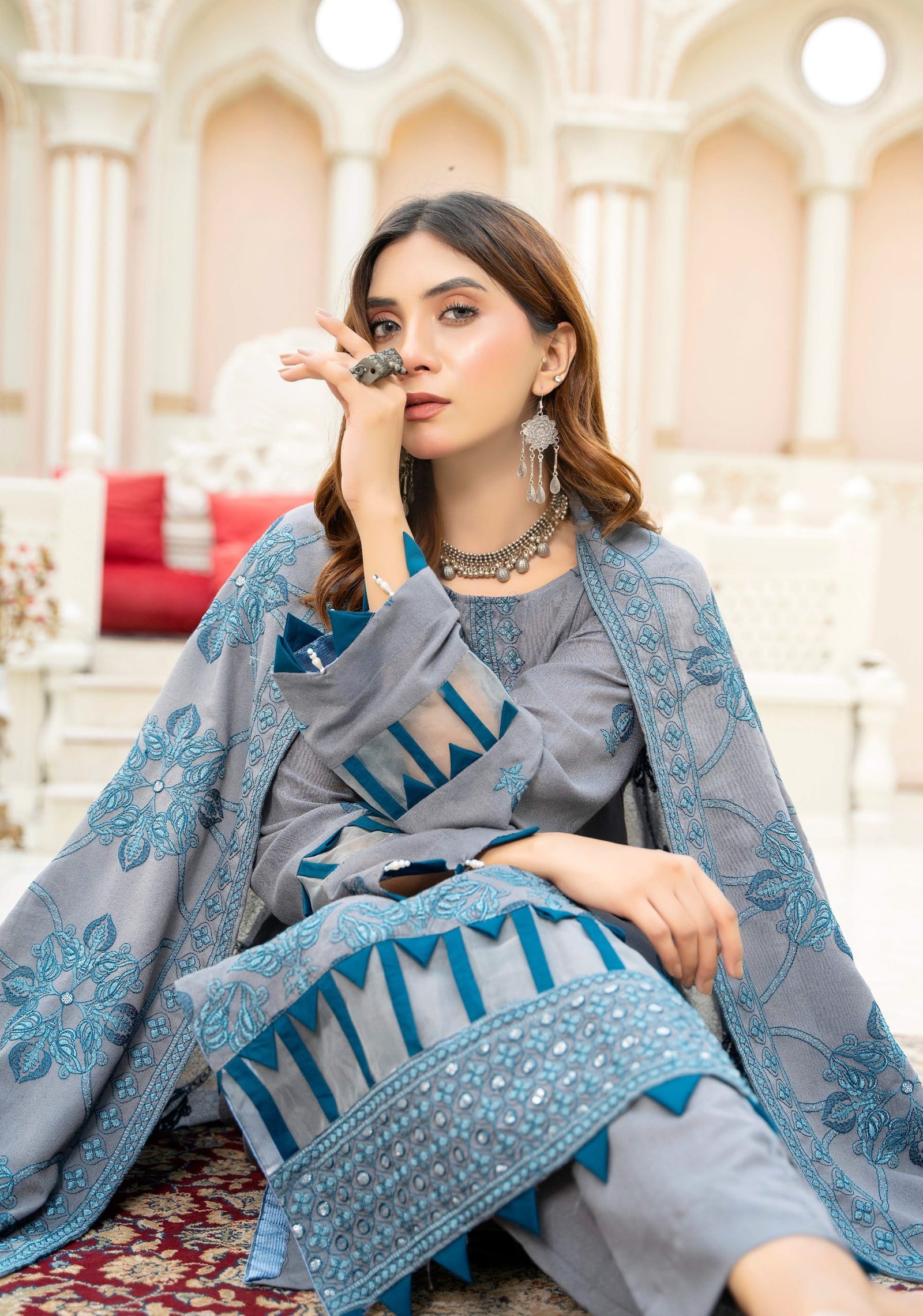 Dupatta: Matching embroidered chiffon dupatta featuring bold floral patterns in teal blue for a luxurious drape.