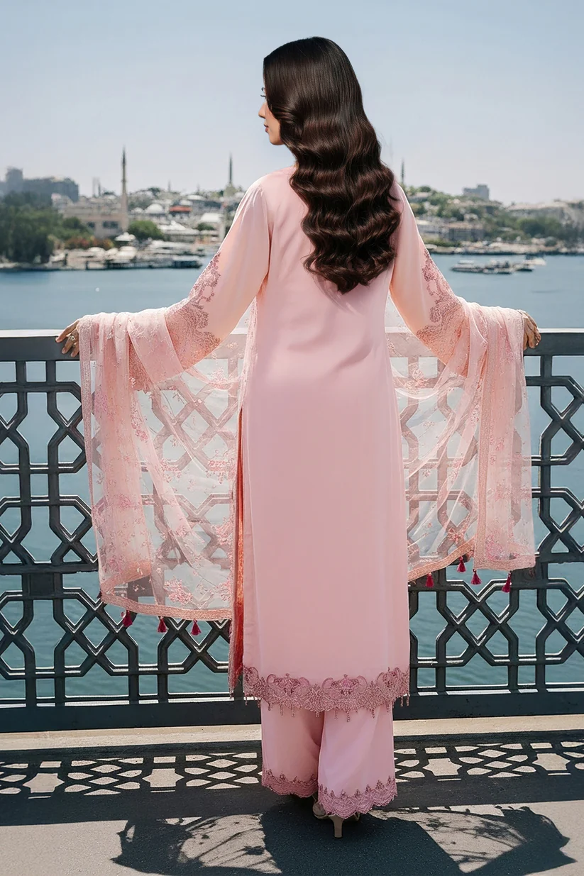 Imrozia Serene I-242 Meleknaaz is an elegant designer ensemble crafted from pure bamber chiffon, featuring an embroidered front enhanced with handmade embellishments for a refined and luxurious look.