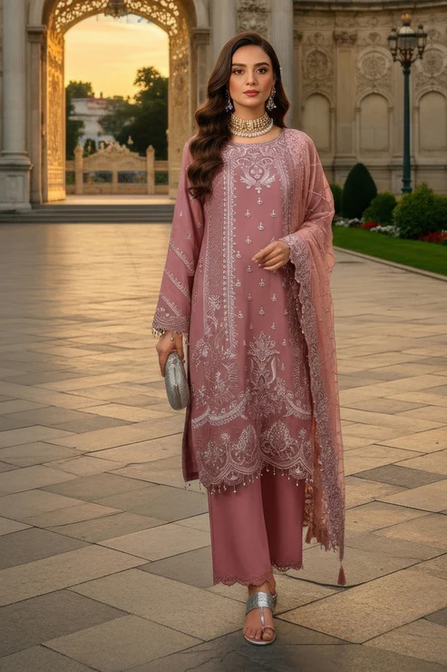 Imrozia Serene I-247 Aysel Embroidered Pure Bamber Chiffon – Tea Pink
