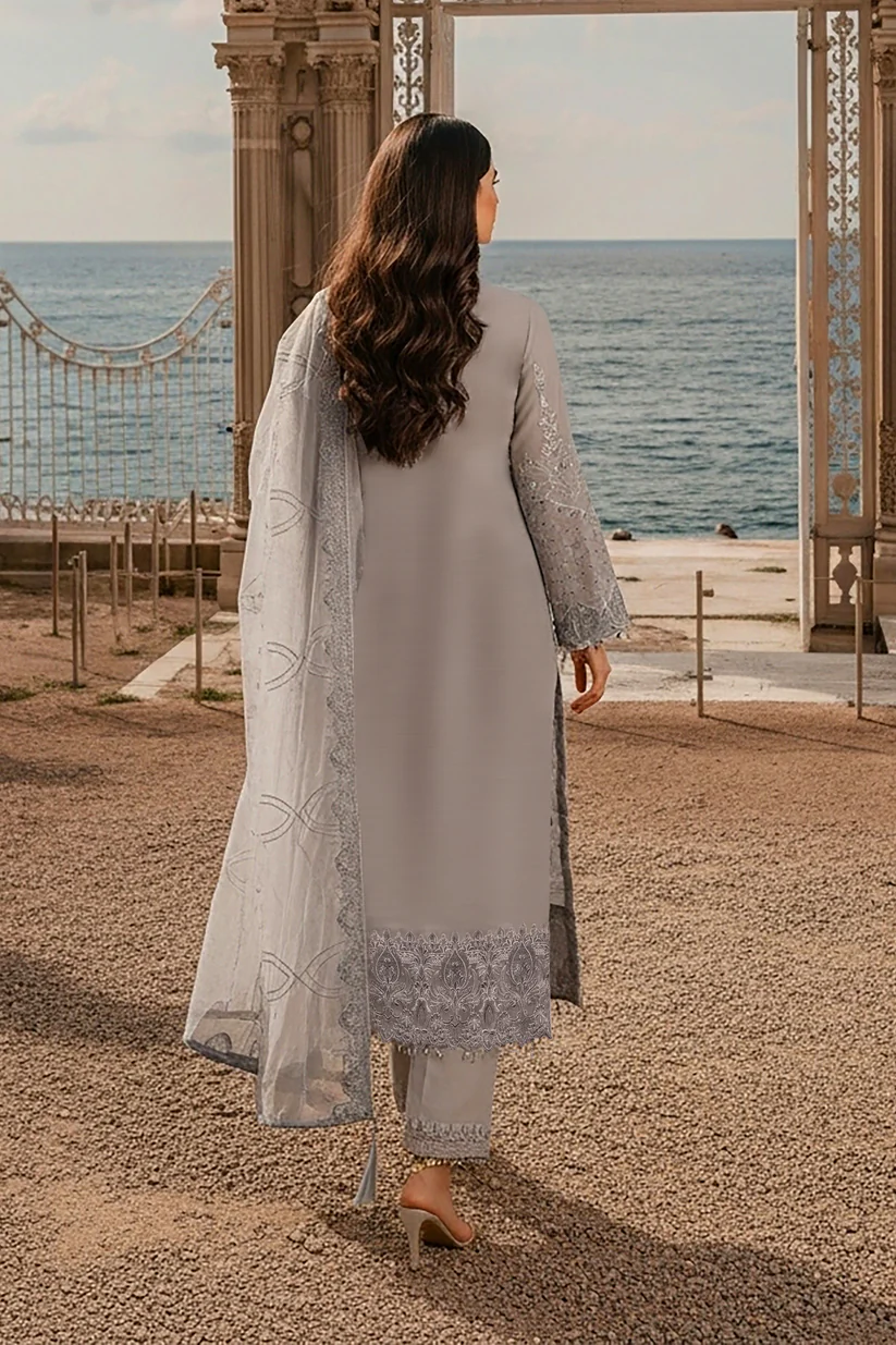 Imrozia Serene I-248 Feray is a luxurious designer ensemble crafted from pure bamber chiffon, featuring an embroidered front enhanced with handmade embellishments for a refined and sophisticated look.