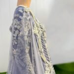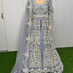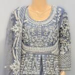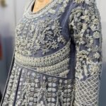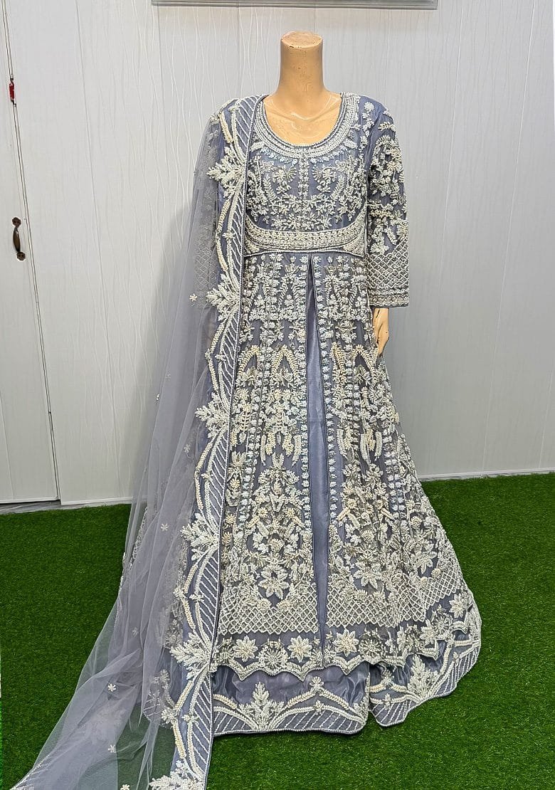Step into timeless elegance with "Iris Frost", a breathtaking bridal ensemble in an icy lilac-grey hue, meticulously hand-embellished to exude grace and royalty. This full-length flared gown features a round neckline with full sleeves and is adorned with intricate silver zari, dabka, naqshi, sequins, pearls, and crystal beadwork that shimmers with every step.