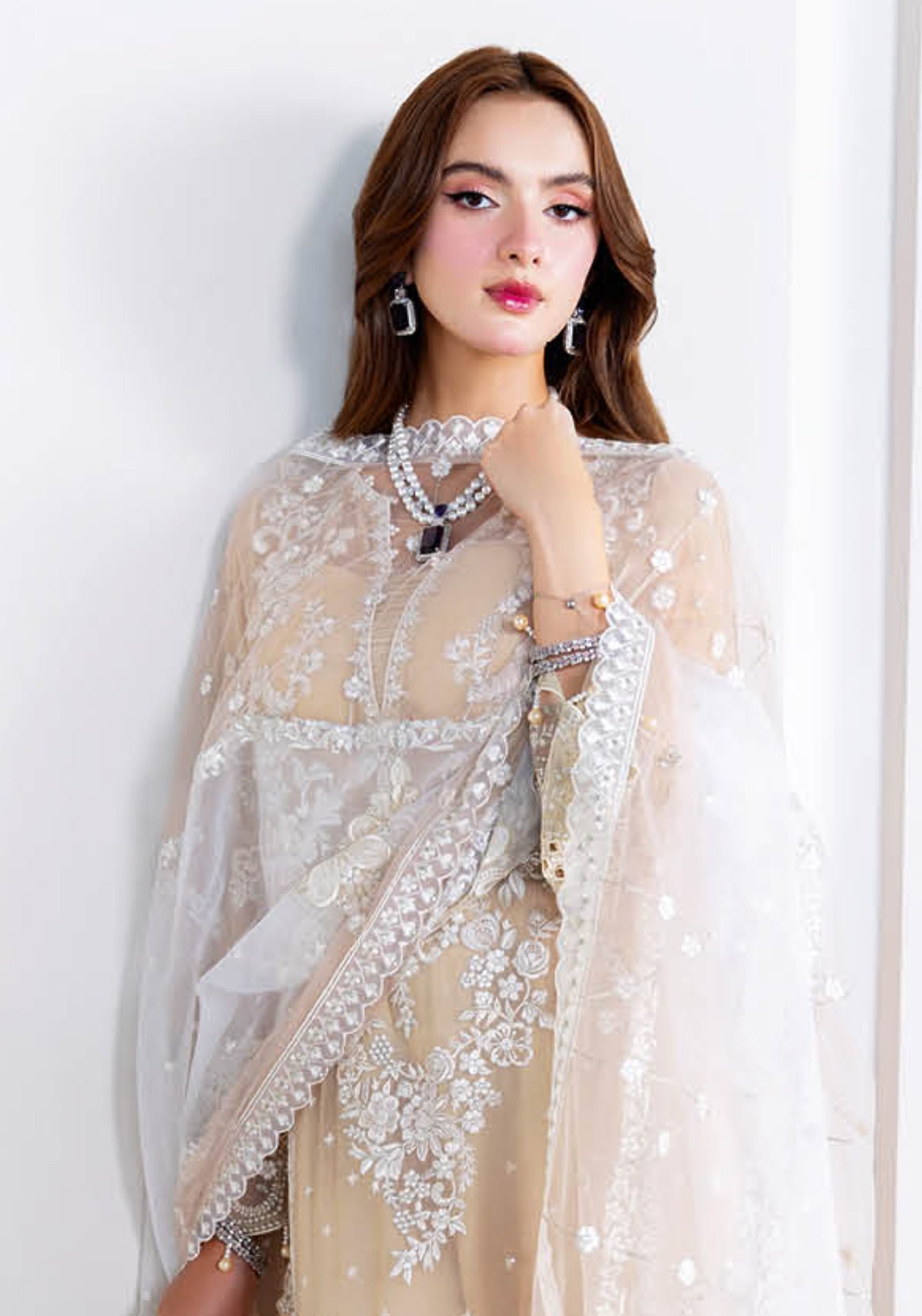 Redefine grace and sophistication with our Ivory Elegance 3-piece unstitched dress. Designed for modern women who cherish timeless fashion, this ensemble is crafted from premium net fabric adorned with intricate white floral embroidery and pearl-like detailing. The soft beige-toned inner lining enhances the charm, while the sheer dupatta with scalloped lace adds a layer of delicate finesse. Perfect for wedding events, bridal showers, or formal soirées, this look speaks volumes of effortless beauty.