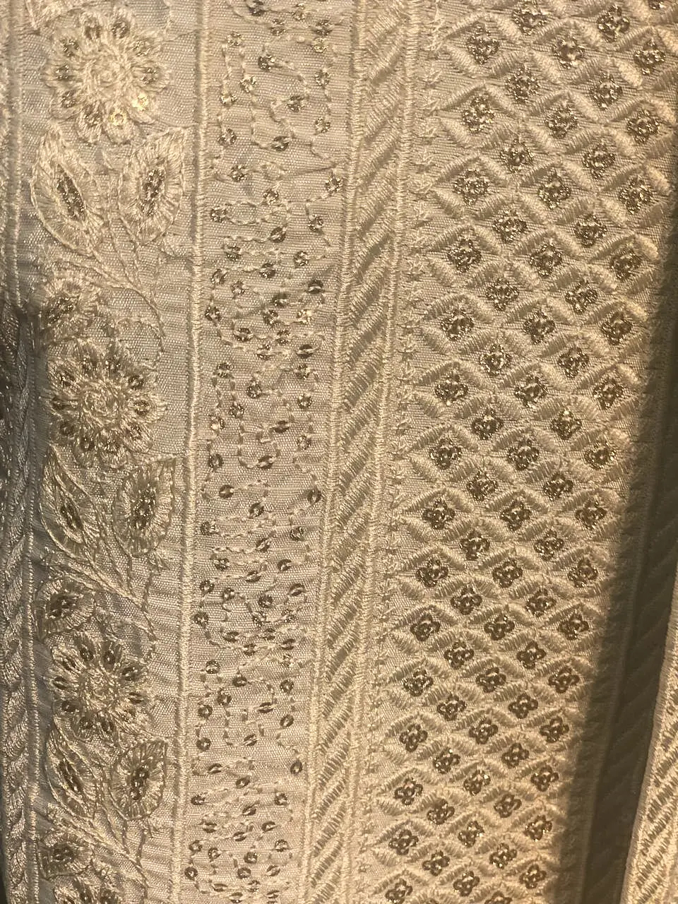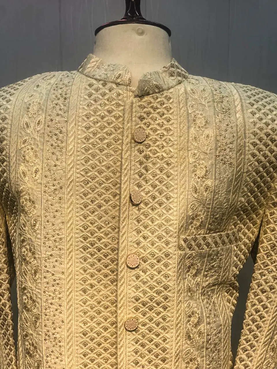 This elegant ivory sherwani is crafted from premium fabric and adorned with intricate golden embroidery. Its subtle off-white base paired with rich golden threadwork creates a perfect balance of class and royalty. Ideal for weddings, engagements, and festive occasions, this sherwani gives the groom a timeless regal charm.