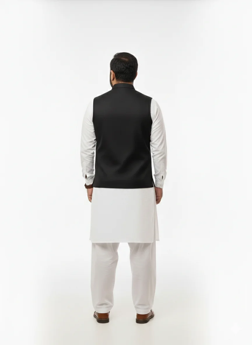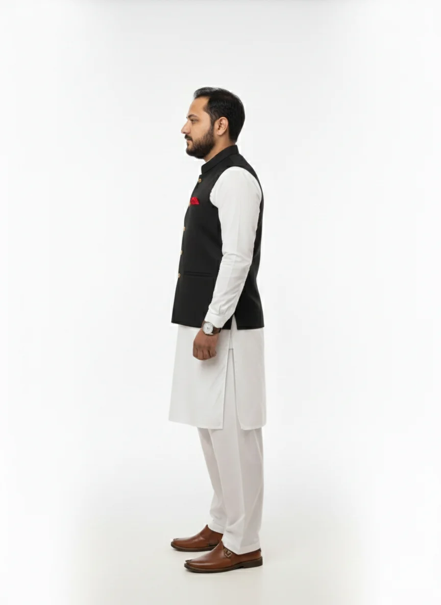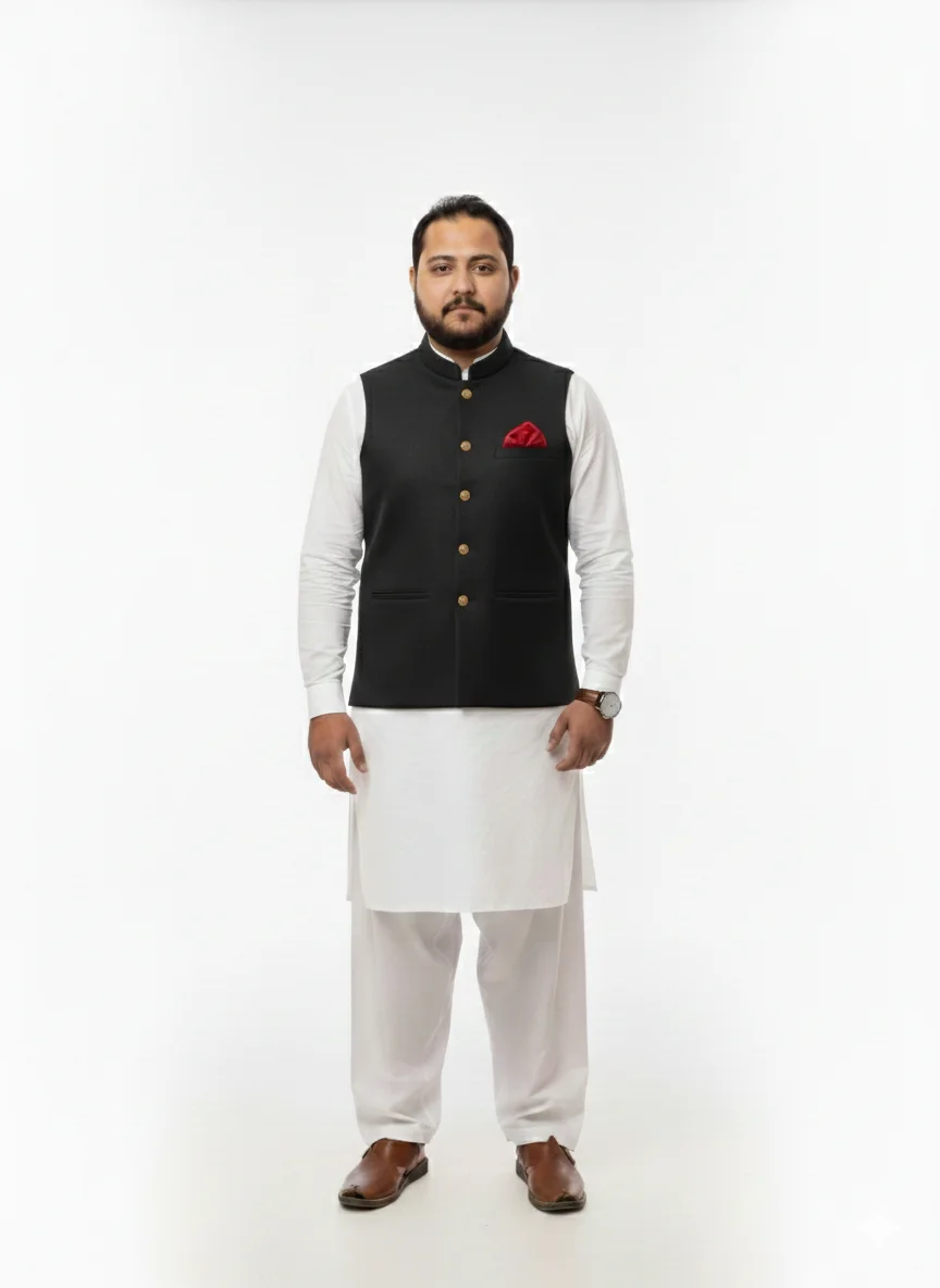 Black color aur gold buttons ka perfect combination! Ye waistcoat modern design aur classic touch ko ek sath jodti hai, jo har tarah ke rasmi jashn aur shaadi ke liye befikri se fit hai. Isme har baat ko dhyan mein rakha gaya hai, jo aapke wardrobe mein shaan badhane ka kaam karegi.