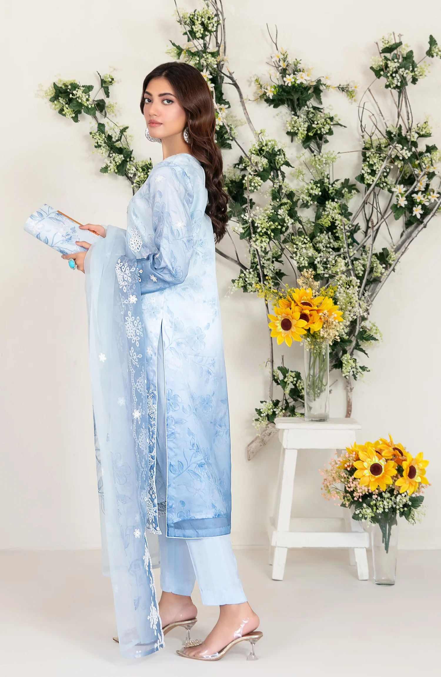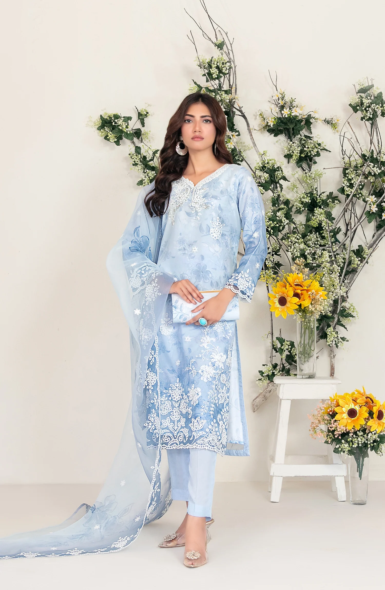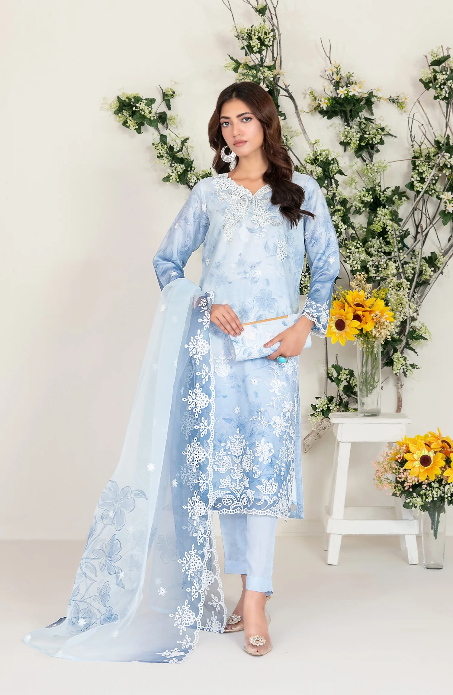Step into timeless elegance with this Larimar by Tawakkal Fabric Embroidered Fancy Organza Suit from the 2025 Collection. Designed in a soothing pastel blue shade, this outfit blends sophistication with modern charm. The kurta is beautifully adorned with delicate floral embroidery on the neckline, hem, and sleeves, paired with a gracefully embroidered organza dupatta for a dreamy appeal.