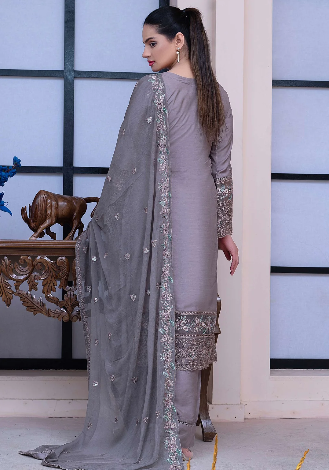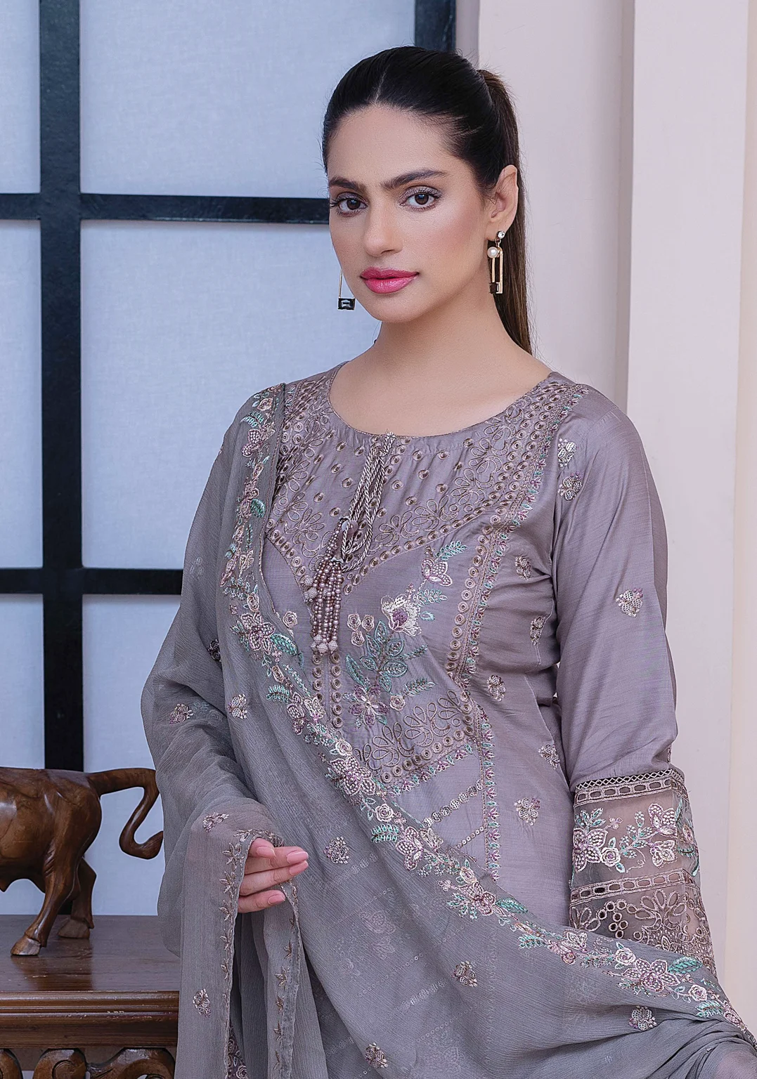 Step into elegance with this Ash Grey embroidered 3-piece suit, crafted from premium chiffon and silk. The kameez features delicate threadwork with mirror accents, paired with wide-leg silk trousers and a chiffon dupatta with floral embroidery. This timeless outfit is perfect for weddings, Eid, and evening gatherings.