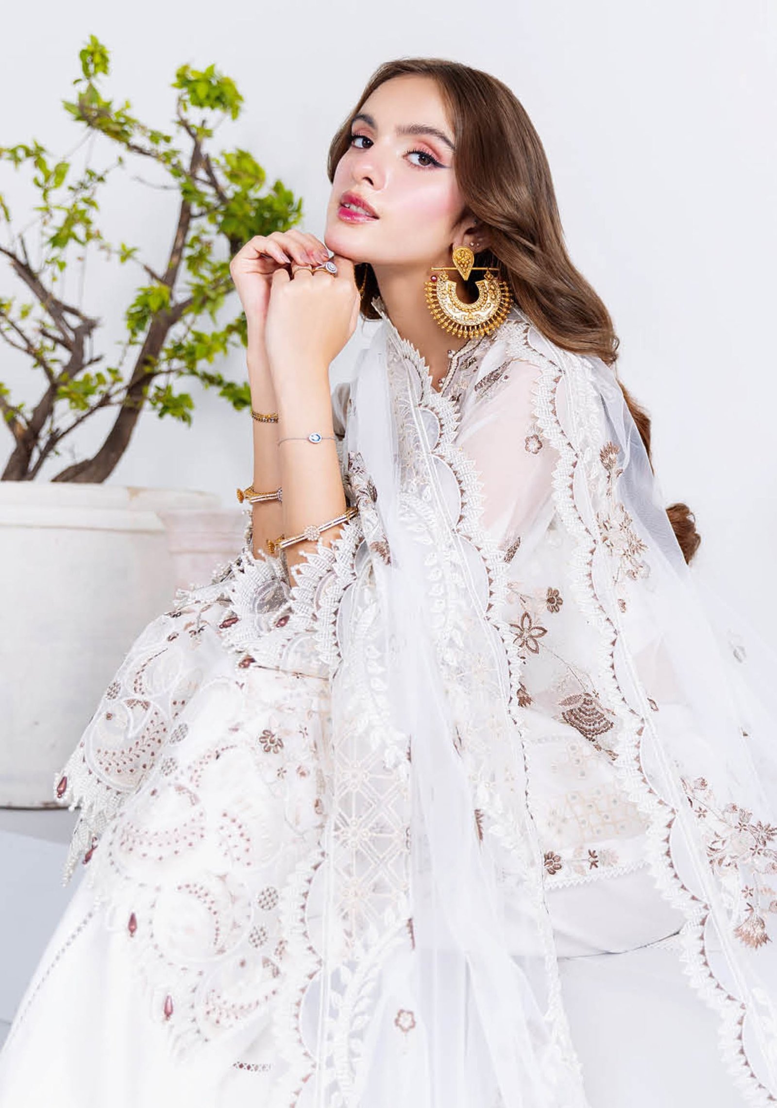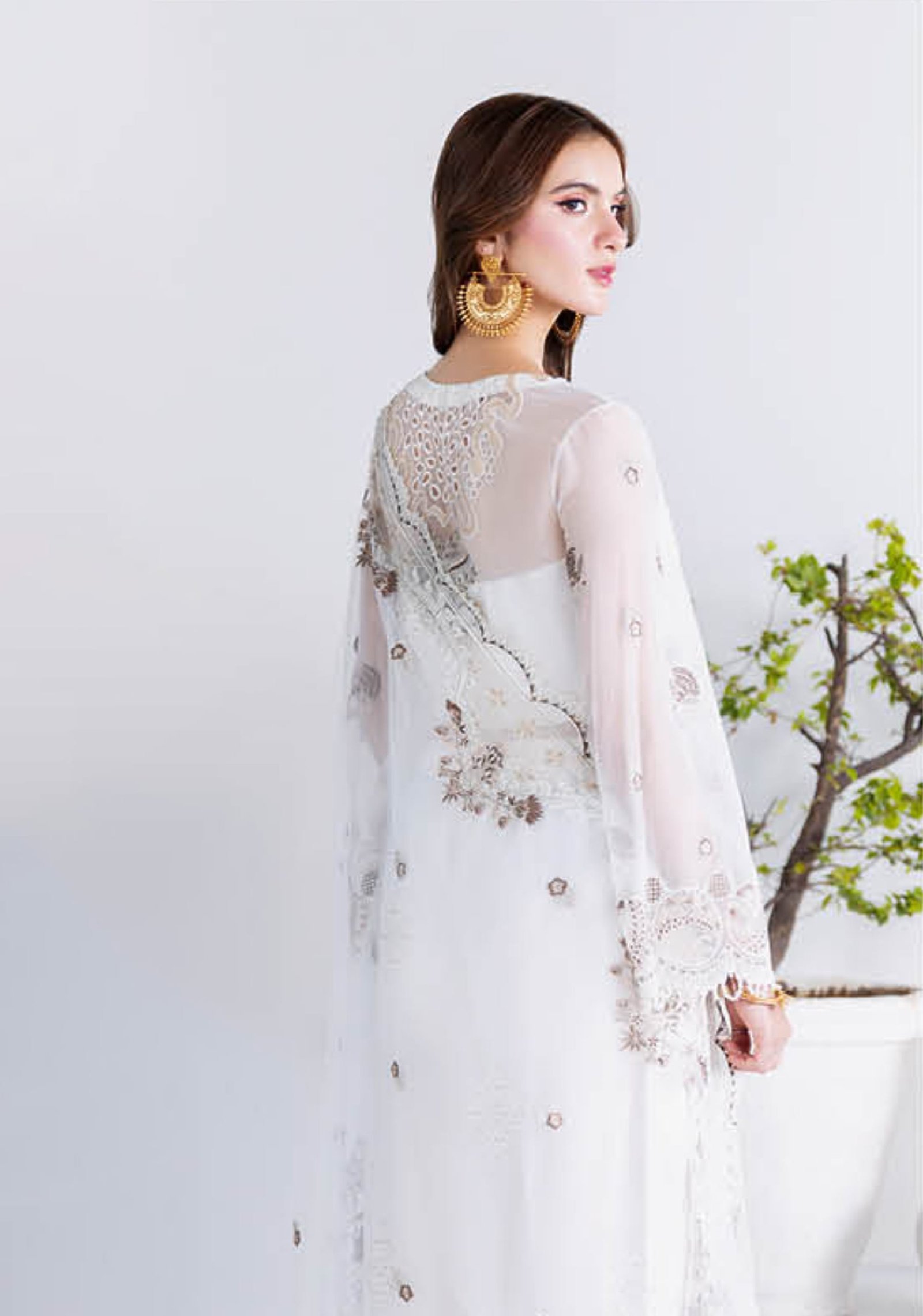 This elegant three-piece white suit is designed with refined craftsmanship and timeless appeal. Made from premium quality organza, it features intricate thread embroidery in soft beige and gold tones, adding sophistication to your festive wardrobe.