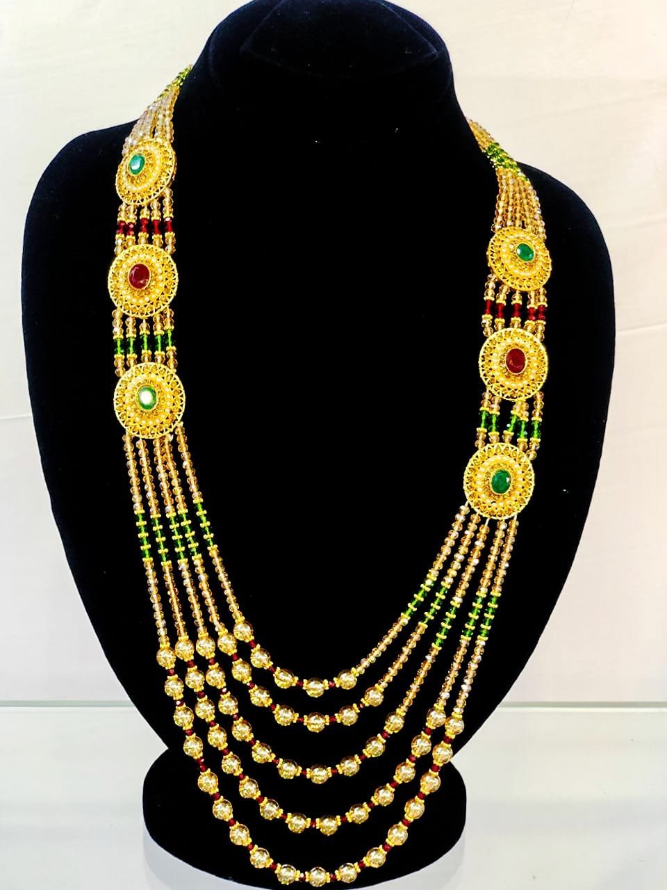 An exquisite multi-layer golden necklace featuring detailed round motifs adorned with red and green stones β€” a royal design that elevates bridal and festive looks.