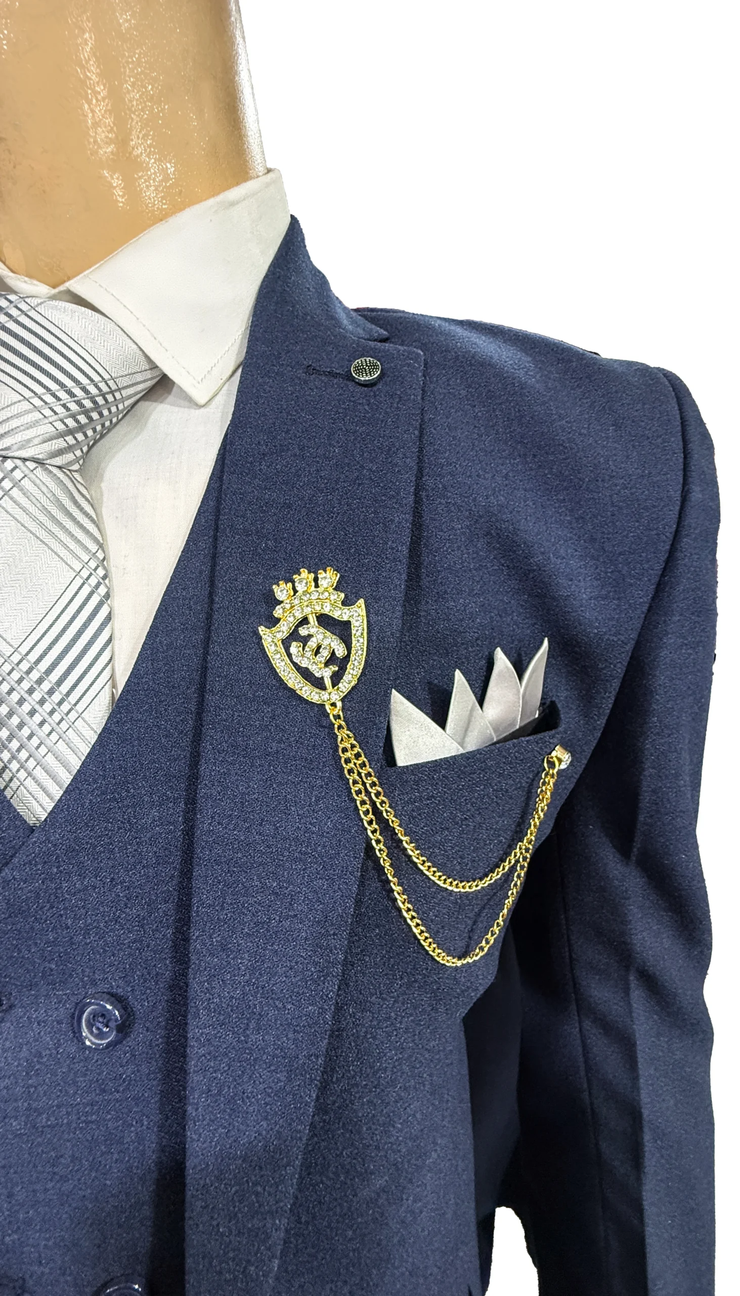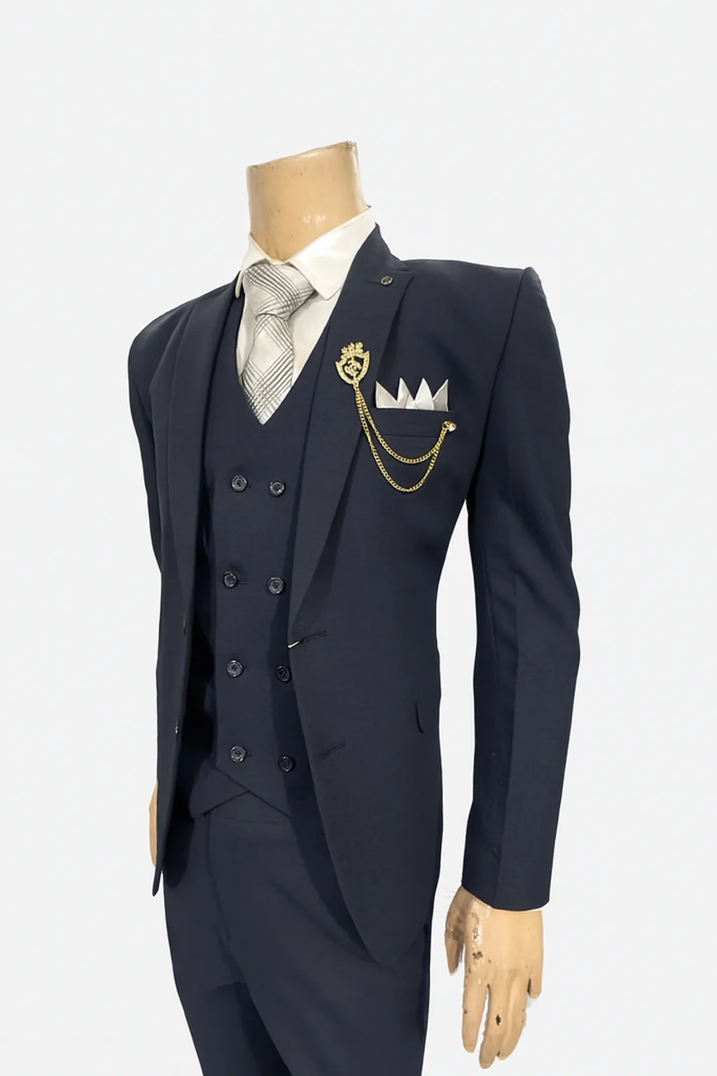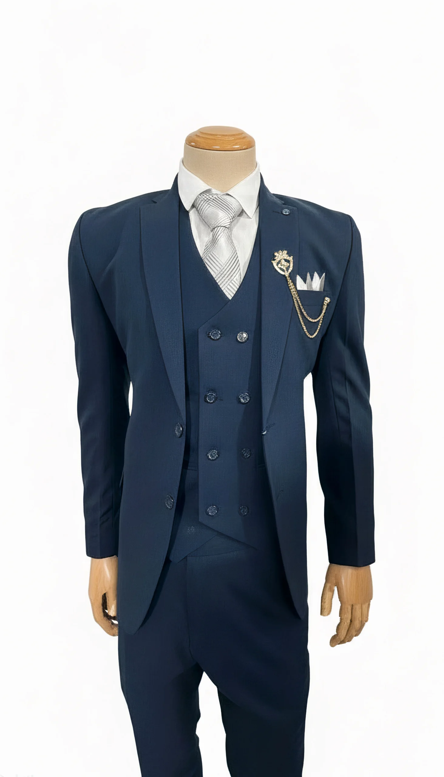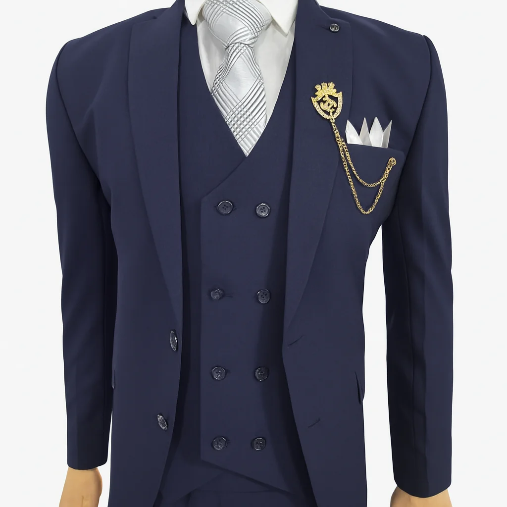 Step into timeless elegance with this premium navy blue men’s 3-piece suit, crafted for formal occasions that demand style and confidence. This ensemble includes a single-breasted blazer, a double-breasted vest, and matching trousers, all tailored for a modern silhouette. The crisp white shirt and silver-striped tie add refined contrast, while the gold lion crest brooch and fan-folded pocket square deliver a distinguished finish.