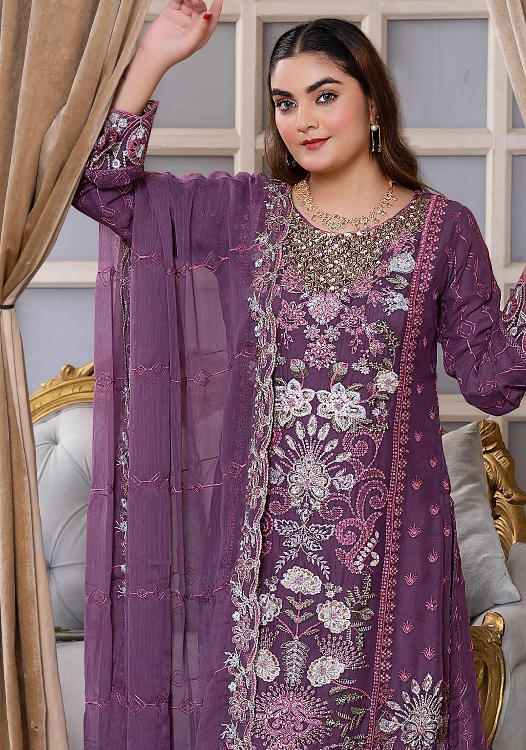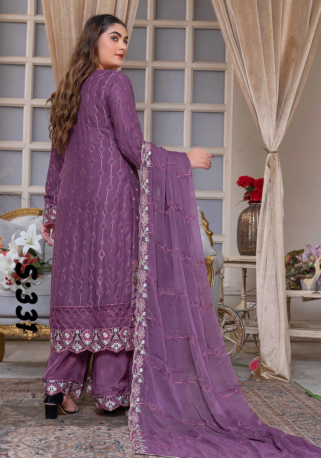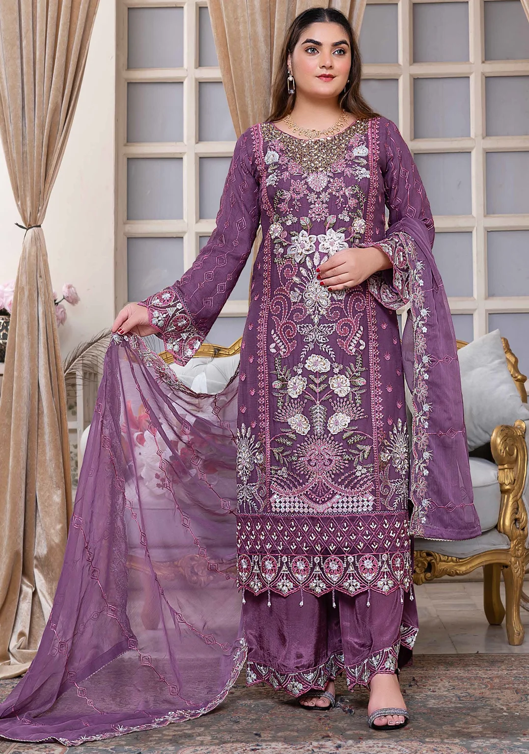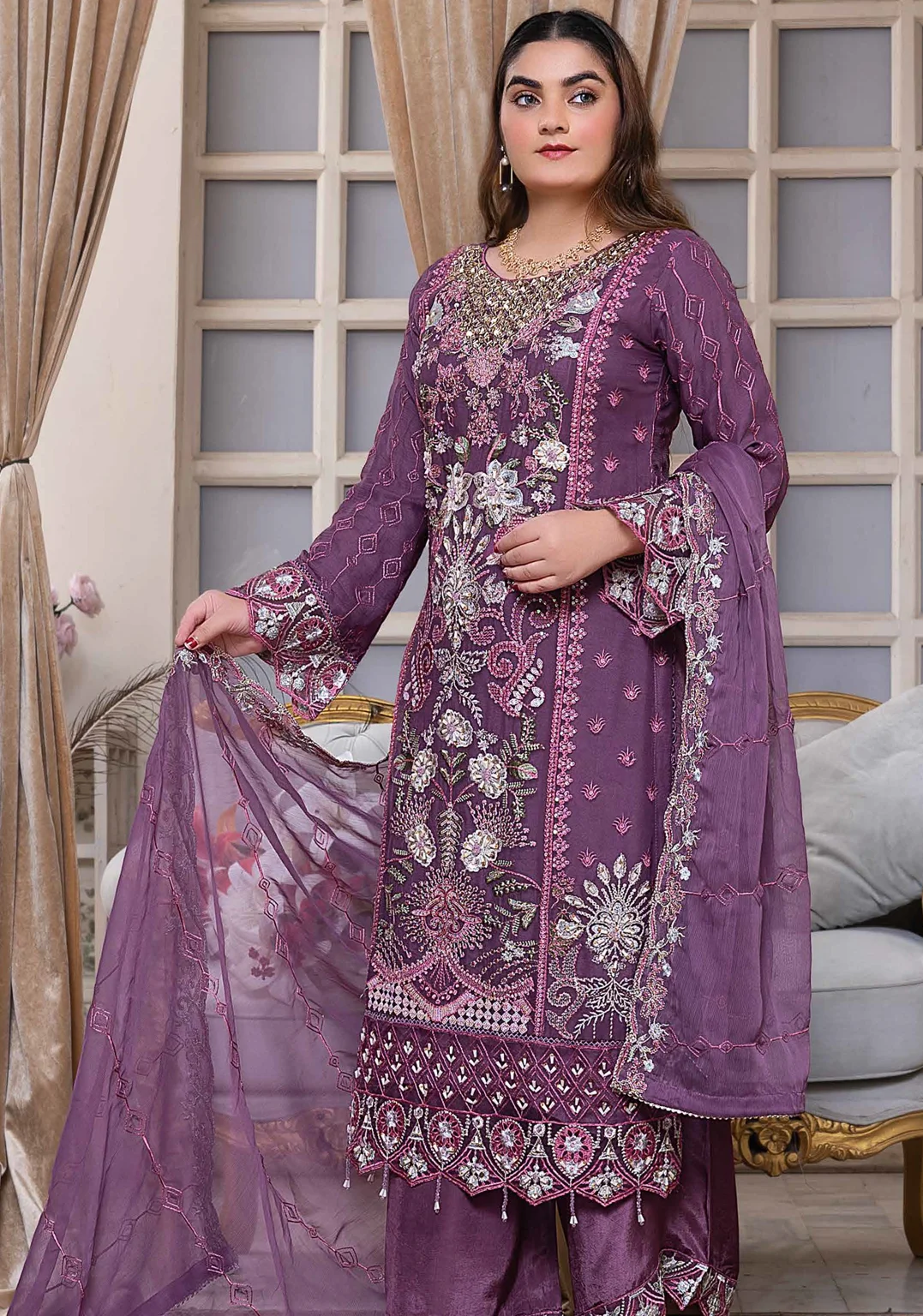 This purple chiffon embroidered 3-piece suit blends elegance and tradition. Adorned with intricate floral embroidery and sequence detailing, it comes with a heavily embroidered front shirt, matching dupatta, and silk trouser. A perfect outfit for Eid, wedding events, and party wear.