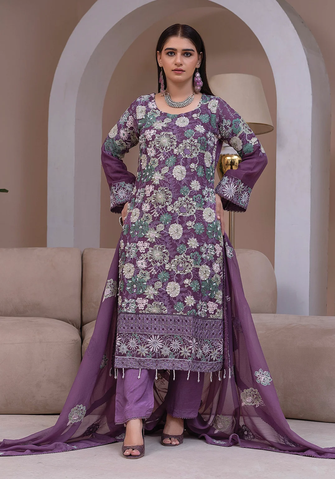Shop luxury purple embroidered chiffon 3-piece suit with floral thread work. Includes embroidered shirt, silk trouser, and chiffon dupatta. Perfect for festive & formal events.