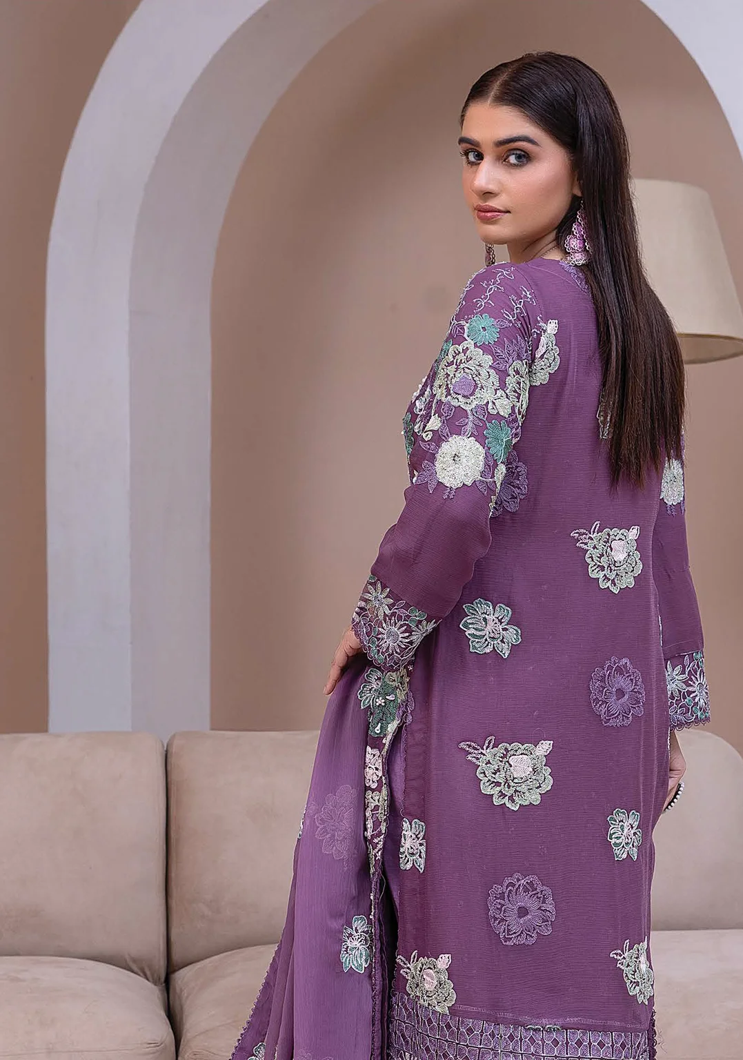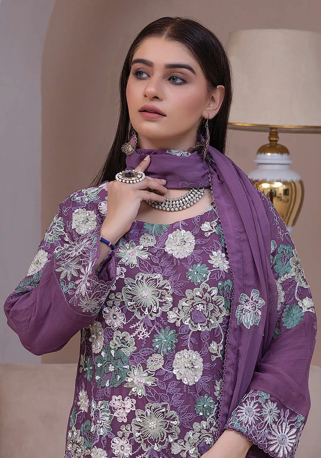 Step into timeless elegance with this purple embroidered chiffon suit. Adorned with delicate floral embroidery in contrasting shades, the shirt is paired with a plain trouser and an embroidered chiffon dupatta. A flawless choice for festive gatherings, parties, or wedding events.