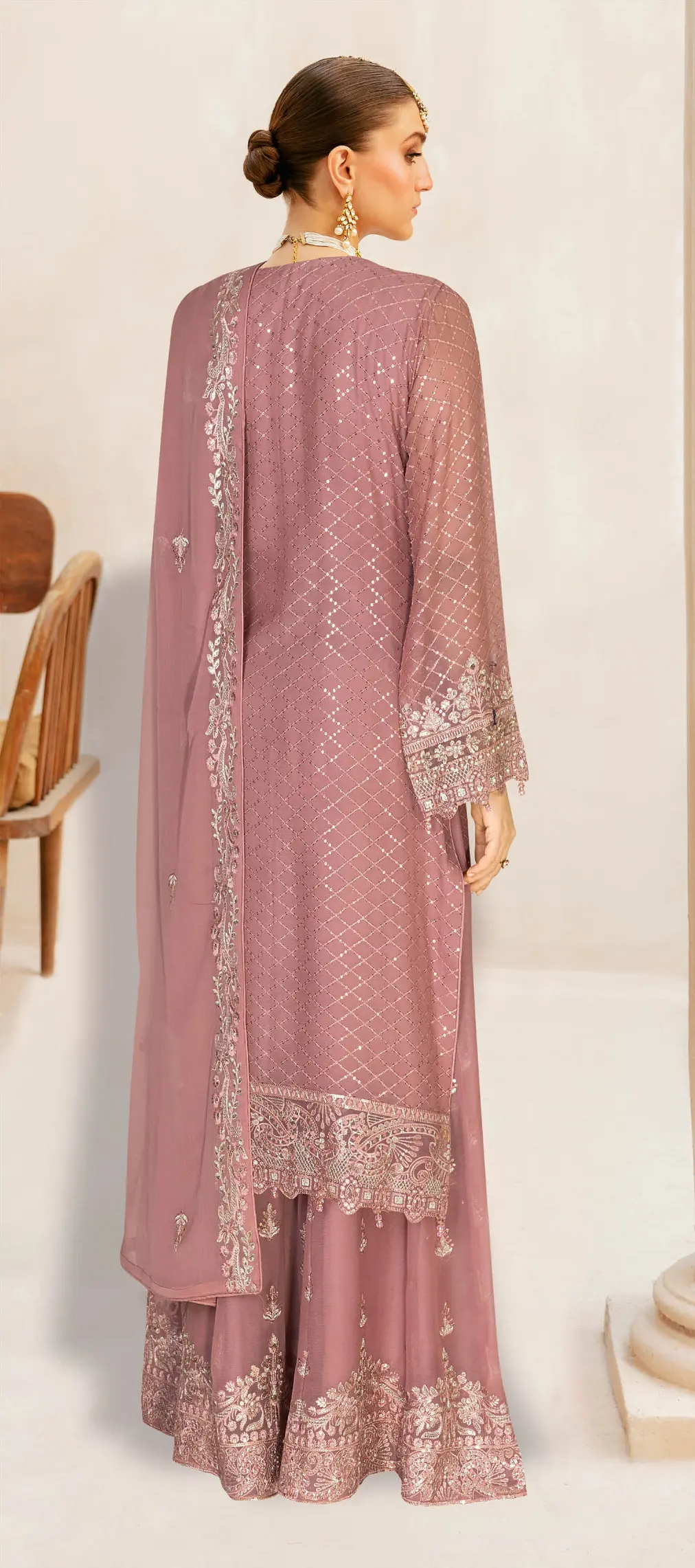 Ramsha WA-449 (WA-449) in mauve pink is a feminine and chic attire designed with exquisite embroidery and sequins. The pastel tone chiffon fabric with a flowy dupatta makes it perfect for festive events and wedding day wear.