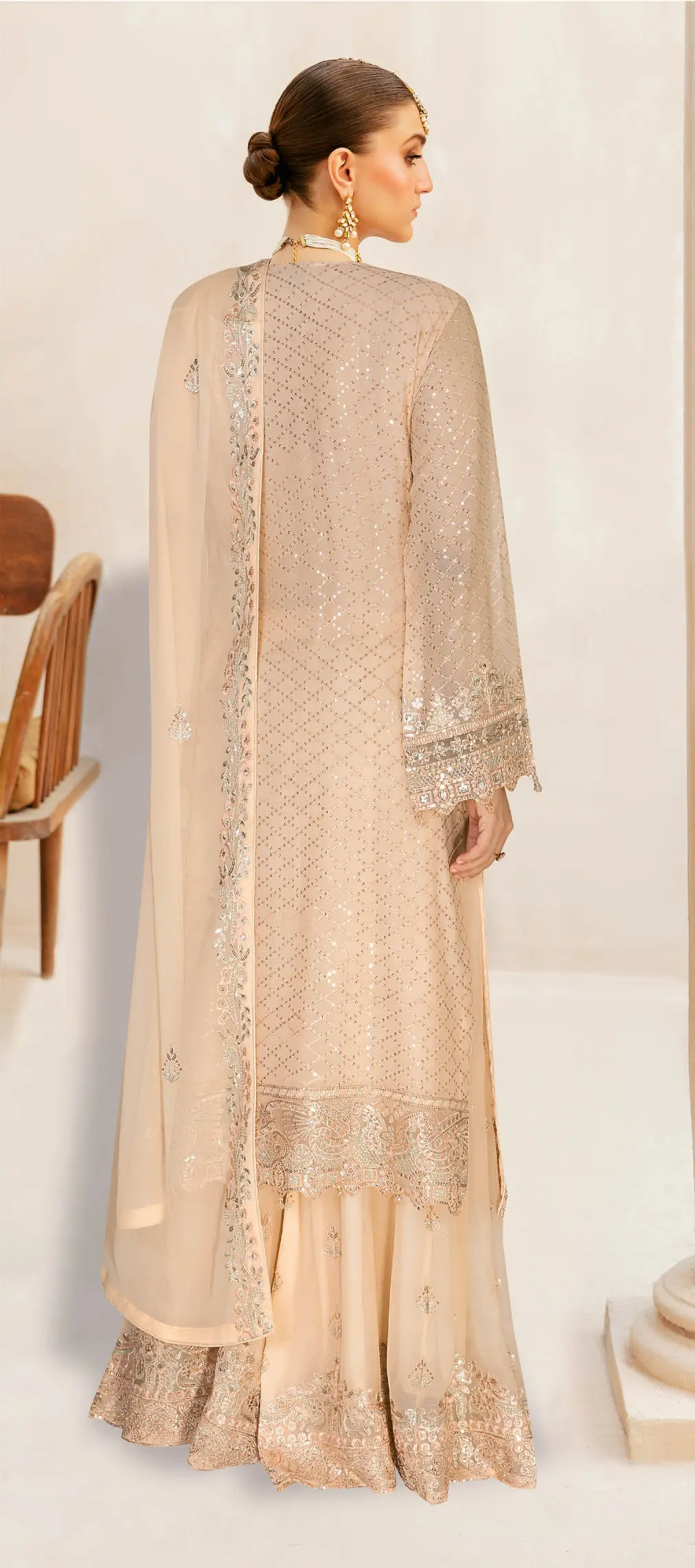 Ramsha WA-449 (WF-449) in cream is a symbol of purity and sophistication. Embellished with detailed embroidery and sequins on chiffon, this outfit is perfect for elegant day events and formal evenings.