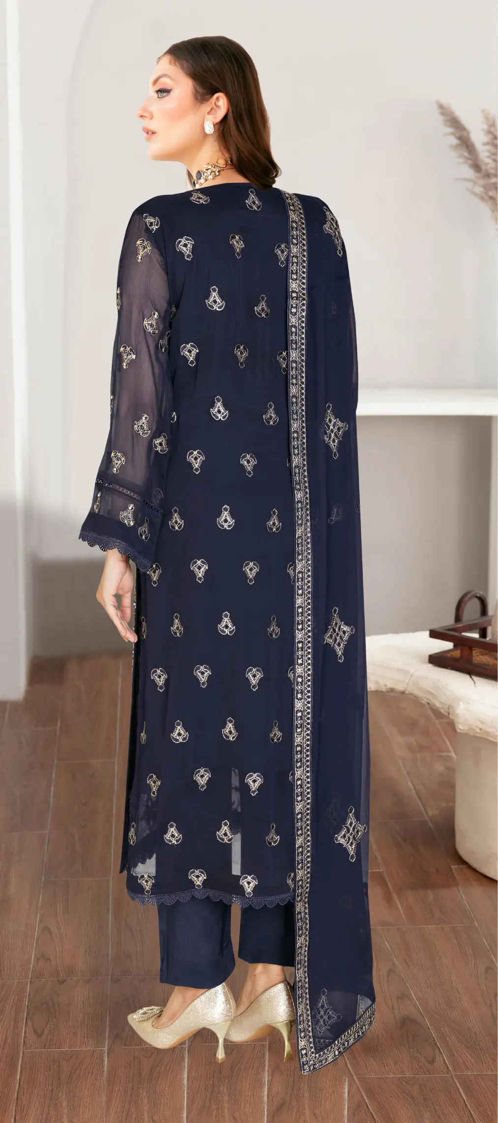 Ramsha WA-495 in navy blue offers a royal and graceful look. With fine embroidery and a flowy chiffon dupatta, this outfit is ideal for receptions and festive gatherings.