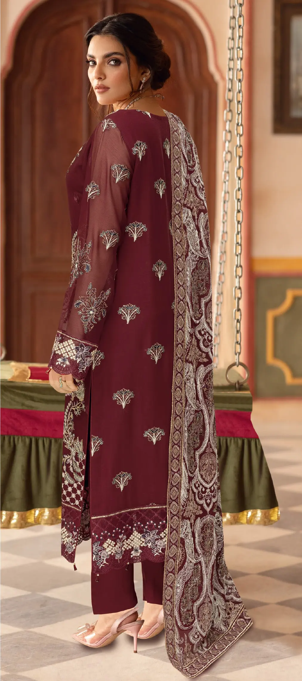 Ramsha WD-514 in deep maroon is a bold and luxurious chiffon outfit crafted with delicate embroidery and sequins. With an embroidered dupatta and plain trouser, this outfit exudes regal charm perfect for wedding functions.
