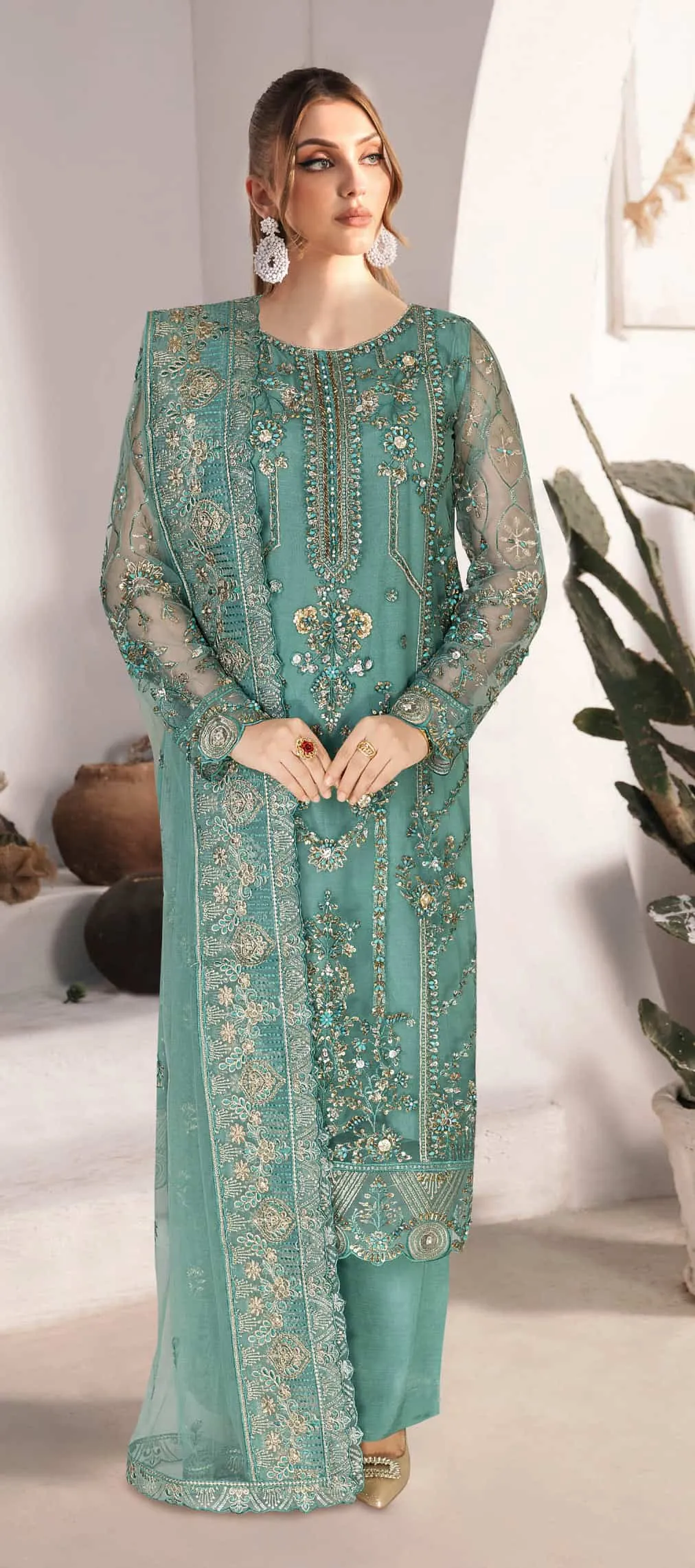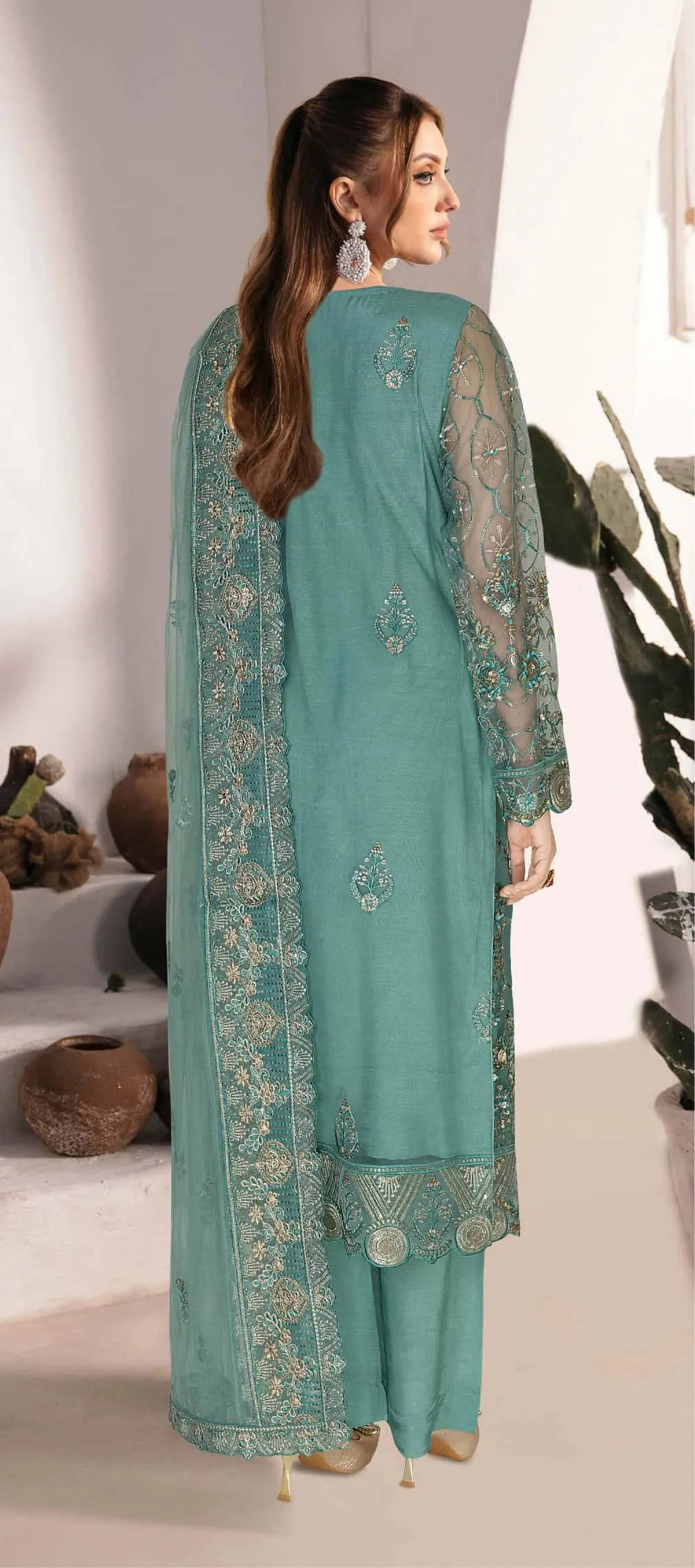 Make a statement with the Ramsha WB-431 luxury chiffon embroidered suit in a stunning green shade. The intricate embroidery with shimmering sequins gives this outfit a regal and festive touch. Perfect for evening parties, weddings, and cultural celebrations, this outfit exudes confidence and sophistication.