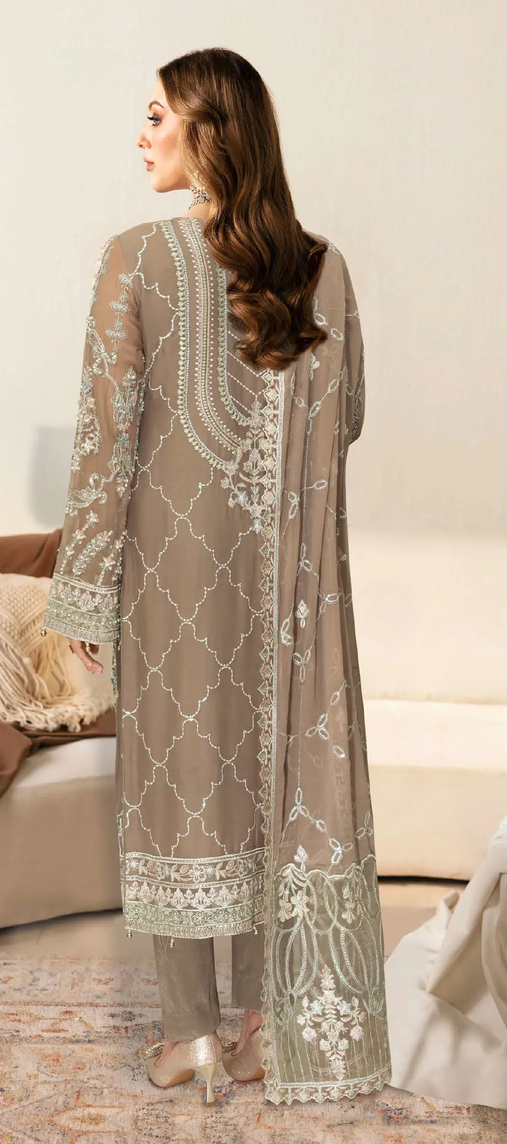 Ramsha WE-497 is a mocha brown chiffon masterpiece, decorated with artistic embroidery in pastel tones. The set includes an embroidered shirt, matching dupatta, and trousers, making it the perfect choice for women who value sophistication with a modern touch.