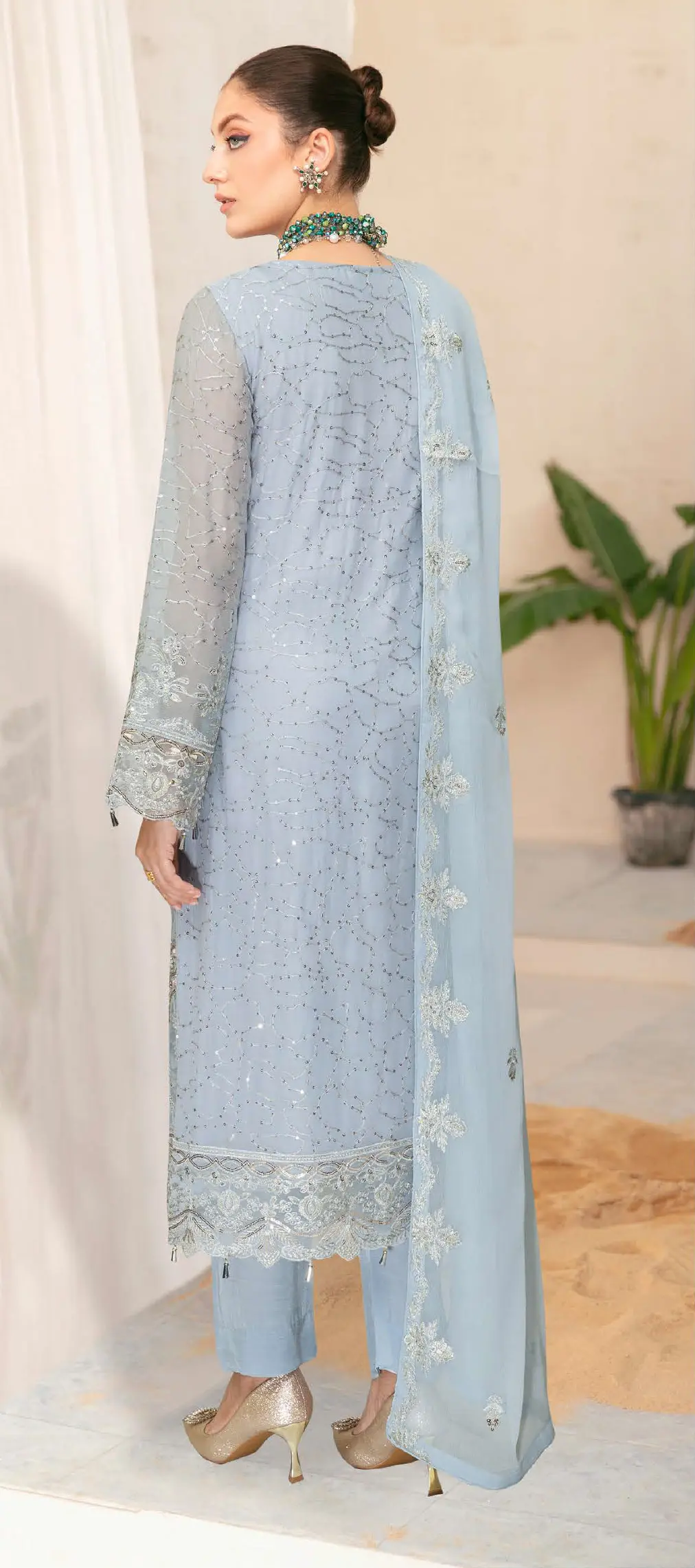 Step into elegance with Ramsha WE-540, a graceful ice blue chiffon outfit adorned with delicate embroidery, sequins, and lace borders. This 3-piece designer suit includes a heavily worked long shirt, tailored trousers, and a beautifully embroidered chiffon dupatta. A dreamy pastel shade and timeless embellishments make it perfect for weddings, parties, and festive occasions.