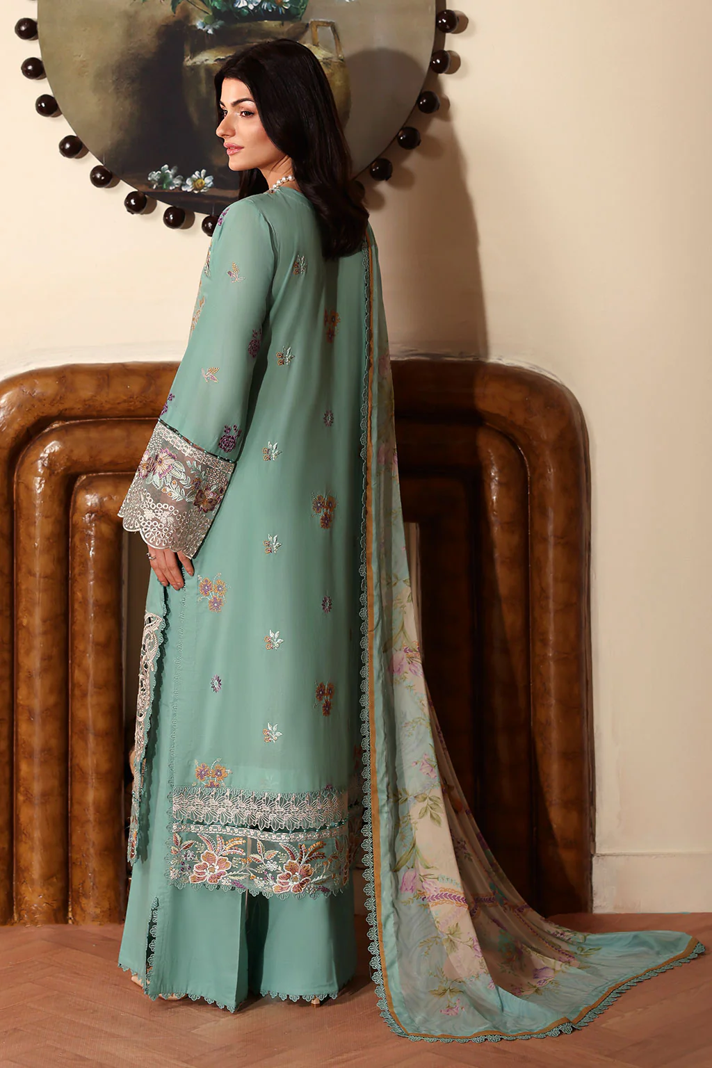 Highlighting premium materials, the suit features a beautifully embroidered lawn front paired with an organza embroidered patch and borders for both front and back. For added elegance, organza borders embellish the embroidered sleeves, ensuring a flawless look from every angle.