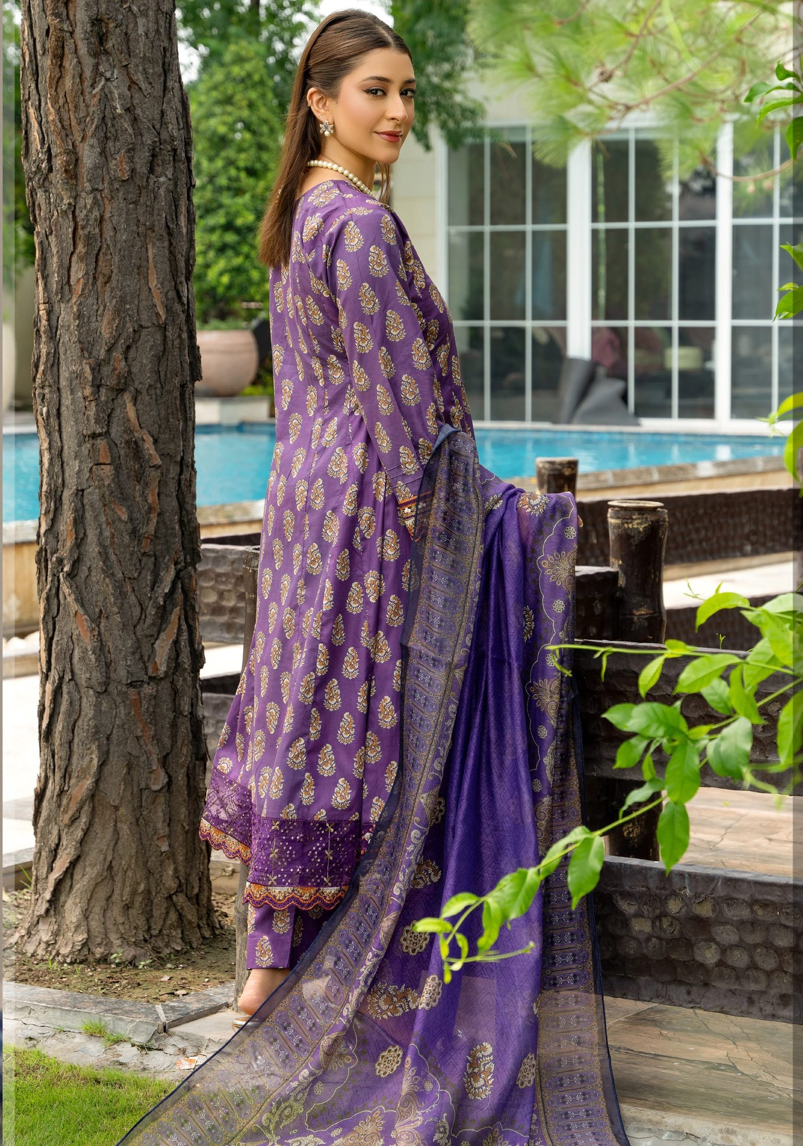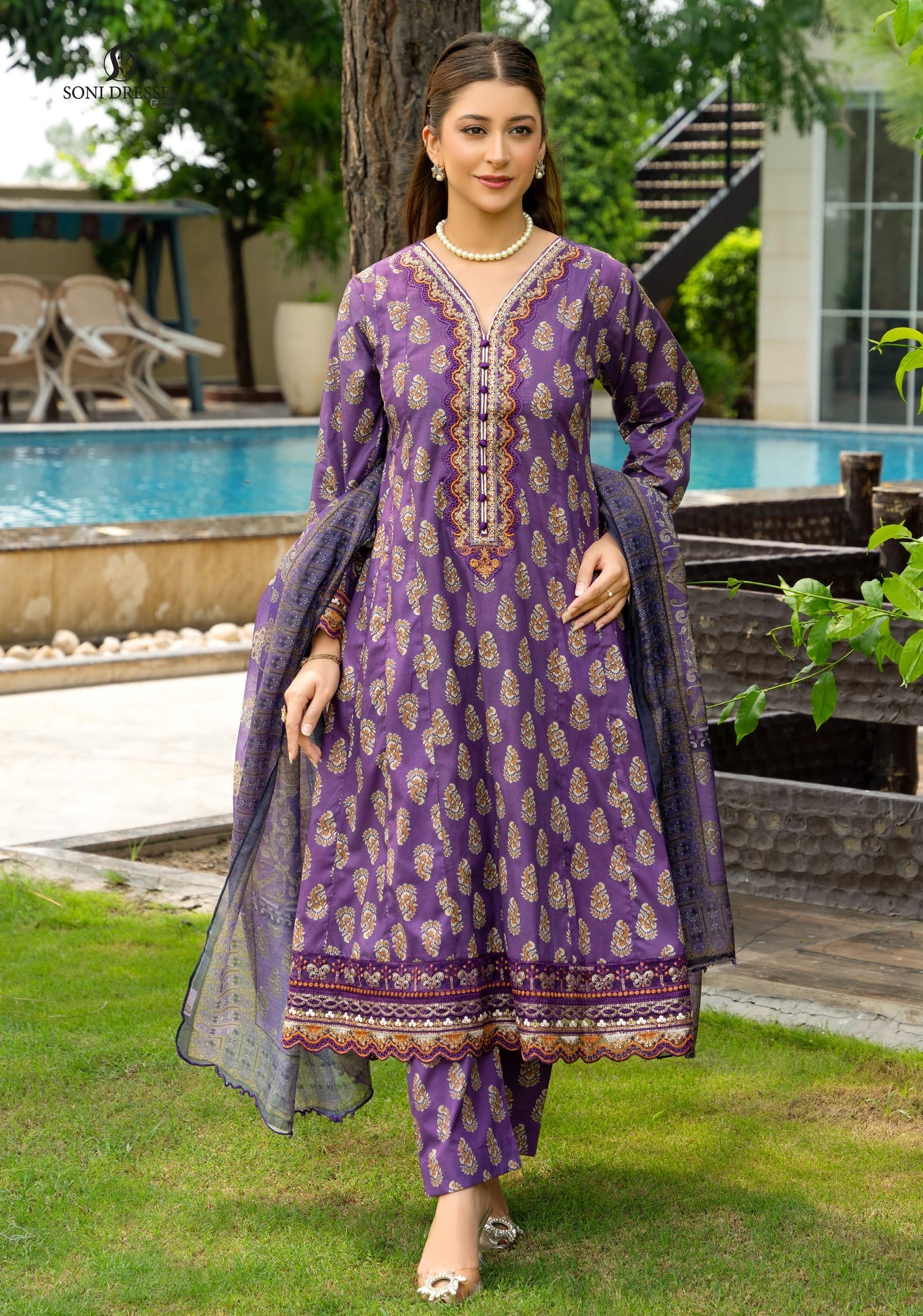 Step into elegance with this royal purple 3-piece unstitched lawn suit from Soni Dresses. Crafted from premium quality lawn fabric, this ensemble boasts intricate paisley-inspired motifs in golden beige, beautifully contrasted with detailed embroidery along the neckline and daman. The rich purple hue is paired with a matching printed dupatta and straight trousers, making it an ideal choice for festive gatherings, semi-formal events, or everyday ethnic glam.
