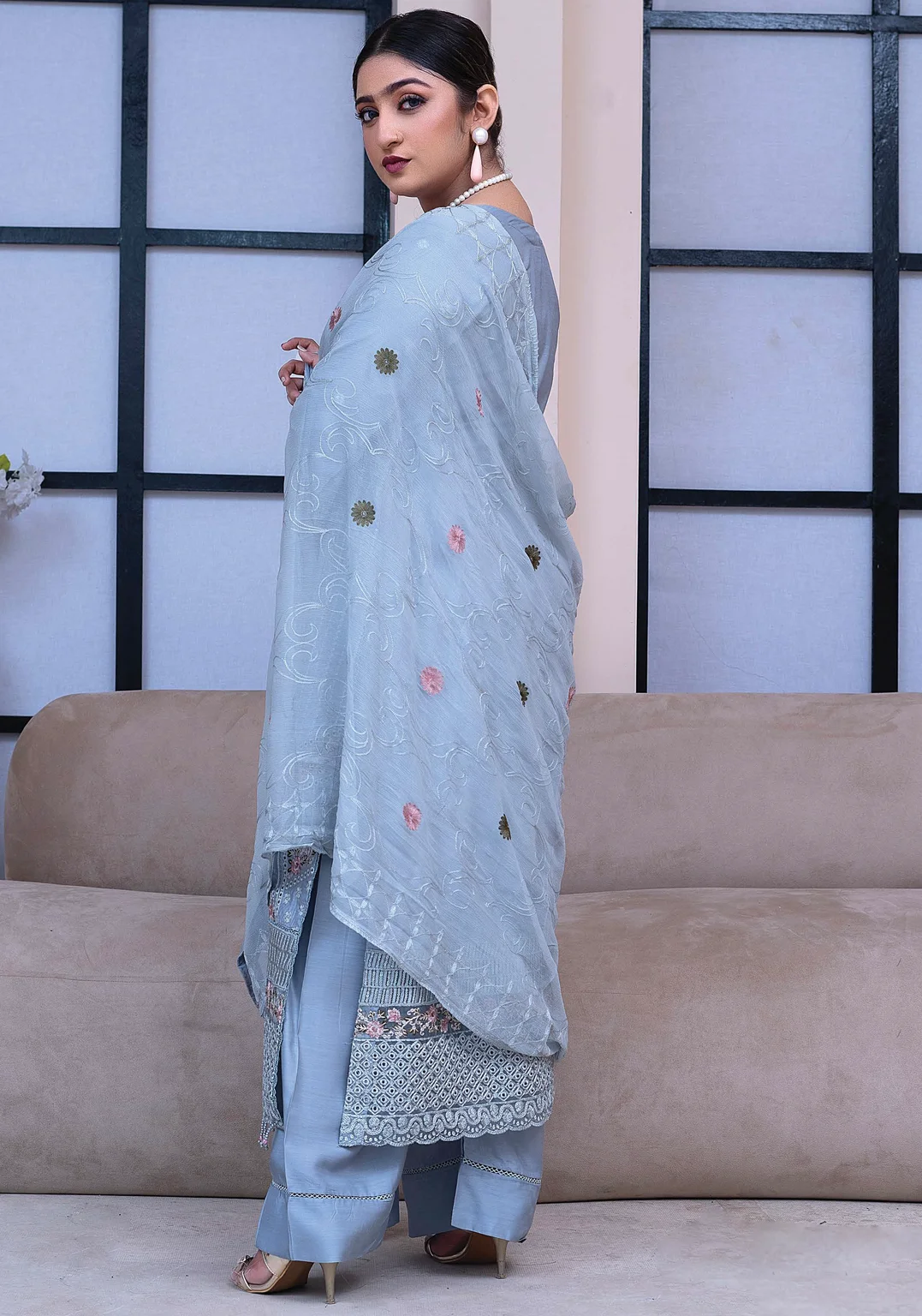 Make a statement in this sky blue embroidered 3-piece suit, designed with intricate thread embroidery in pastel tones. The shirt is adorned with delicate detailing along the neckline and sleeves, paired with matching trousers and a flowy chiffon dupatta that adds a graceful touch. A timeless outfit for festive gatherings and party wear.