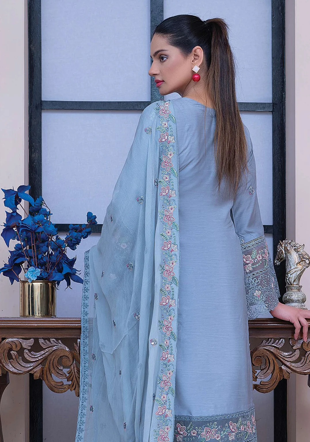 Radiate charm with this Sky Blue embroidered 3-piece suit, a graceful blend of traditional embroidery and modern cuts. The floral threadwork and mirror embellishments enhance its elegance, while the silk trousers and chiffon dupatta add a luxurious finish.