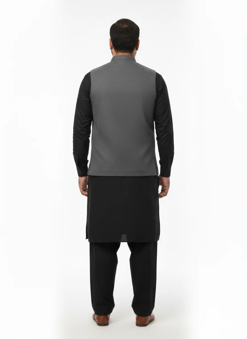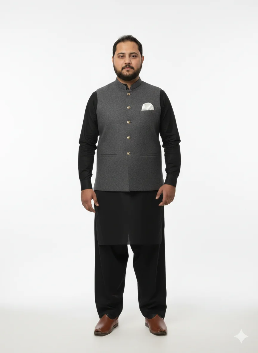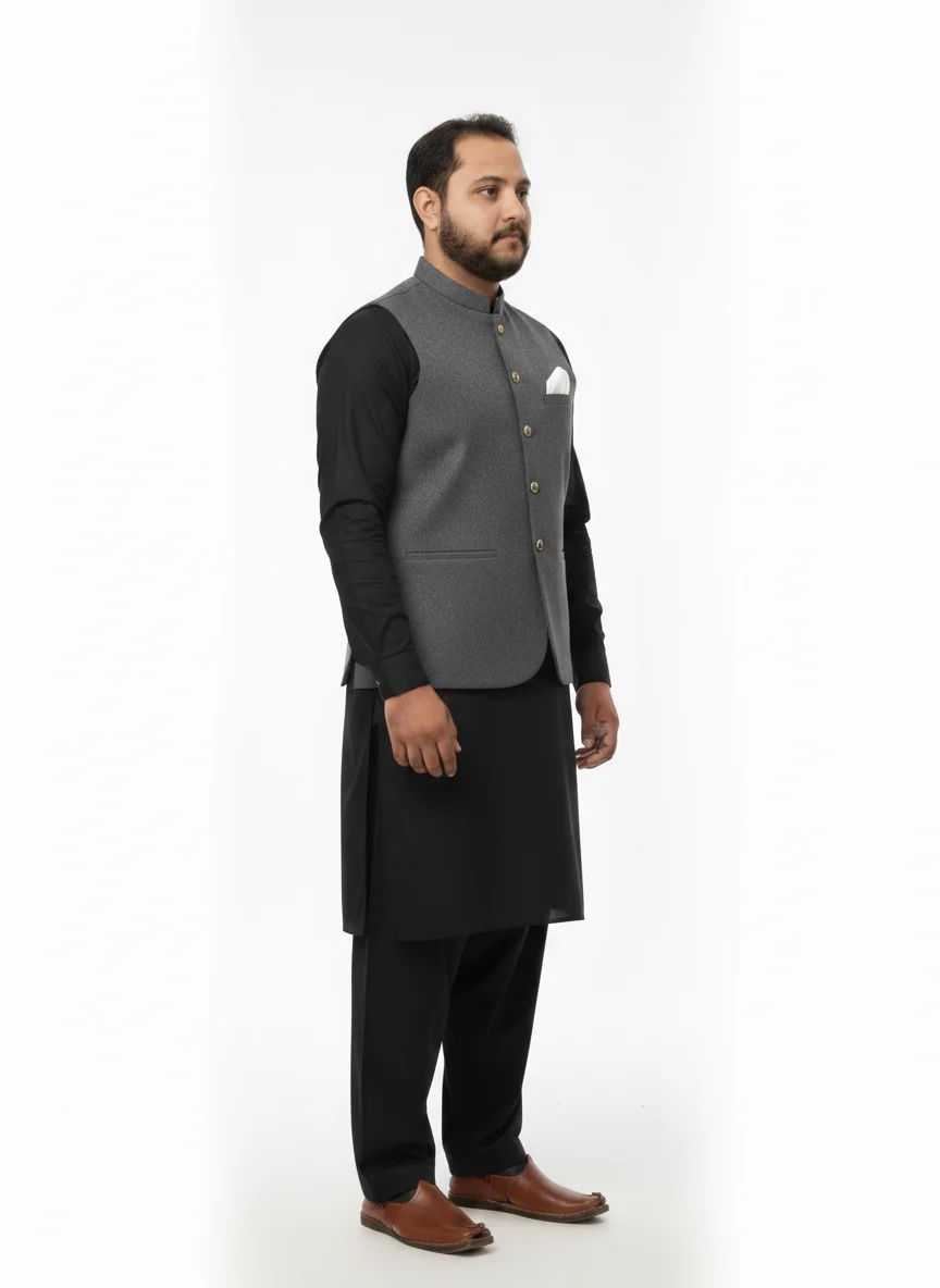 Description: A wardrobe essential. This Slate Grey waistcoat offers a crisp, clean look for the professional man. Its neutral tone pairs effortlessly with any kurta color. Features a premium finish, soft lining, and a slim-cut design to give you a sharp, polished appearance.